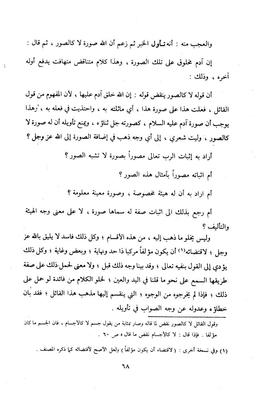 أَن قَوْله لَا كالصور ينْقض قَوْله إِن الله خلق آدم عَلَيْهَا لِأَن الْمَفْهُوم من قَول الْقَائِل فعلت هَذَا على صُورَة هَذَا أَي ماثلته بِهِ واحتذيت فِي فعله بِهِ وَهَذَا يُوجب أَن صُورَة آدم عَلَيْهِ السَّلَام كصورته جلّ ثَنَاؤُهُ وَيمْنَع تَأْوِيله أَن لَهُ صُورَة لَا كالصور وليت شعري إِلَى أَي وَجه ذهب فِي إِضَافَة الصُّورَة إِلَى الله عز وَجل