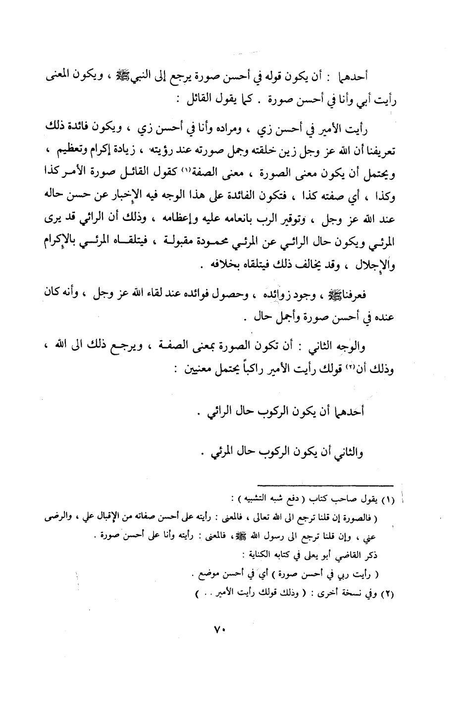 رَأَيْت الْأَمِير فِي أحسن زِيّ وَمرَاده وَأَنا فِي أحسن زِيّ وَيكون فَائِدَة ذَلِك تعريفنا أَن الله عز وَجل زين خلقته وجمل صورته عِنْد رُؤْيَته زِيَادَة إكرام وتعظيم وَيحْتَمل أَن يكون معنى الصُّورَة معنى الصّفة كَقَوْل الْقَائِل صُورَة الْأَمر كَذَا وَكَذَا أَي صفته كَذَا فَتكون الْفَائِدَة على هَذَا الْوَجْه فِيهِ الْإِخْبَار عَن حسن حَاله عندالله عز وَجل وتوقير الرب بإنعامه عَلَيْهِ وإعظامه وَذَلِكَ أَن الرَّائِي قد يرى المرئي وَيكون حَال الرَّائِي عَن المرئي محمودة مَقْبُولَة فيتلقاه المرئي بالإكرام والإجلال وَقد يُخَالف ذَلِك فيتلقاه بِخِلَافِهِ