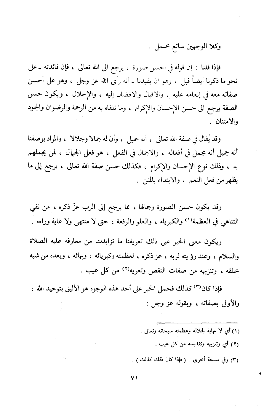 وَقد يُقَال فِي صفة الله تَعَالَى أَنه جميل وَأَن لَهُ جمالا وجلالا وَالْمرَاد بوصفنا أَنه جميل أَنه مُجمل فِي أَفعاله والإجمال فِي الْفِعْل هُوَ فعل الْجمال لمن يجملهم بِهِ وَذَلِكَ نوع الْإِحْسَان وَالْإِكْرَام فَكَذَلِك حسن صفة الله تَعَالَى يرجع إِلَى مَا يظْهر من فعل النعم والإبتداء بالمنن