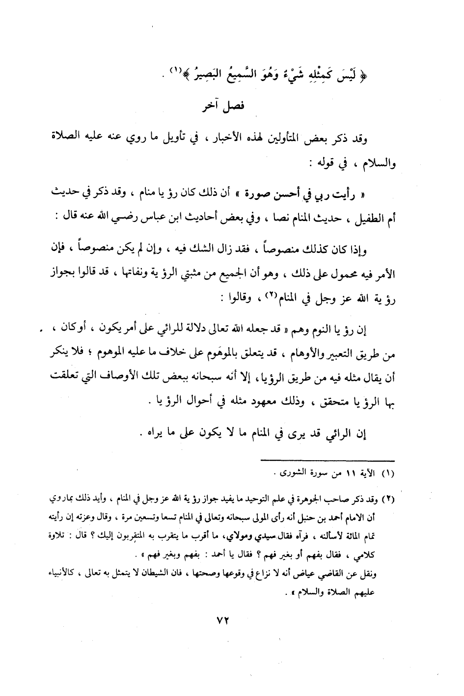 إِن رُؤْيا النّوم وهم قد جعله الله تَعَالَى دلَالَة للرائي على أَمر يكون أَو كَانَ من طَرِيق التَّعْبِير والأوهام قد يتَعَلَّق بالموهوم على خلاف مَا عَلَيْهِ الموهوم فَلَا يُنكر أَن يُقَال مثله فِيهِ من طَرِيق الرُّؤْيَا إِلَّا أَنه سُبْحَانَهُ بِبَعْض تِلْكَ الْأَوْصَاف الَّتِي تعلّقت بهَا الرُّؤْيَا مُتَحَقق وَذَلِكَ مَعْهُود مثله فِي أَحْوَال الرُّؤْيَا