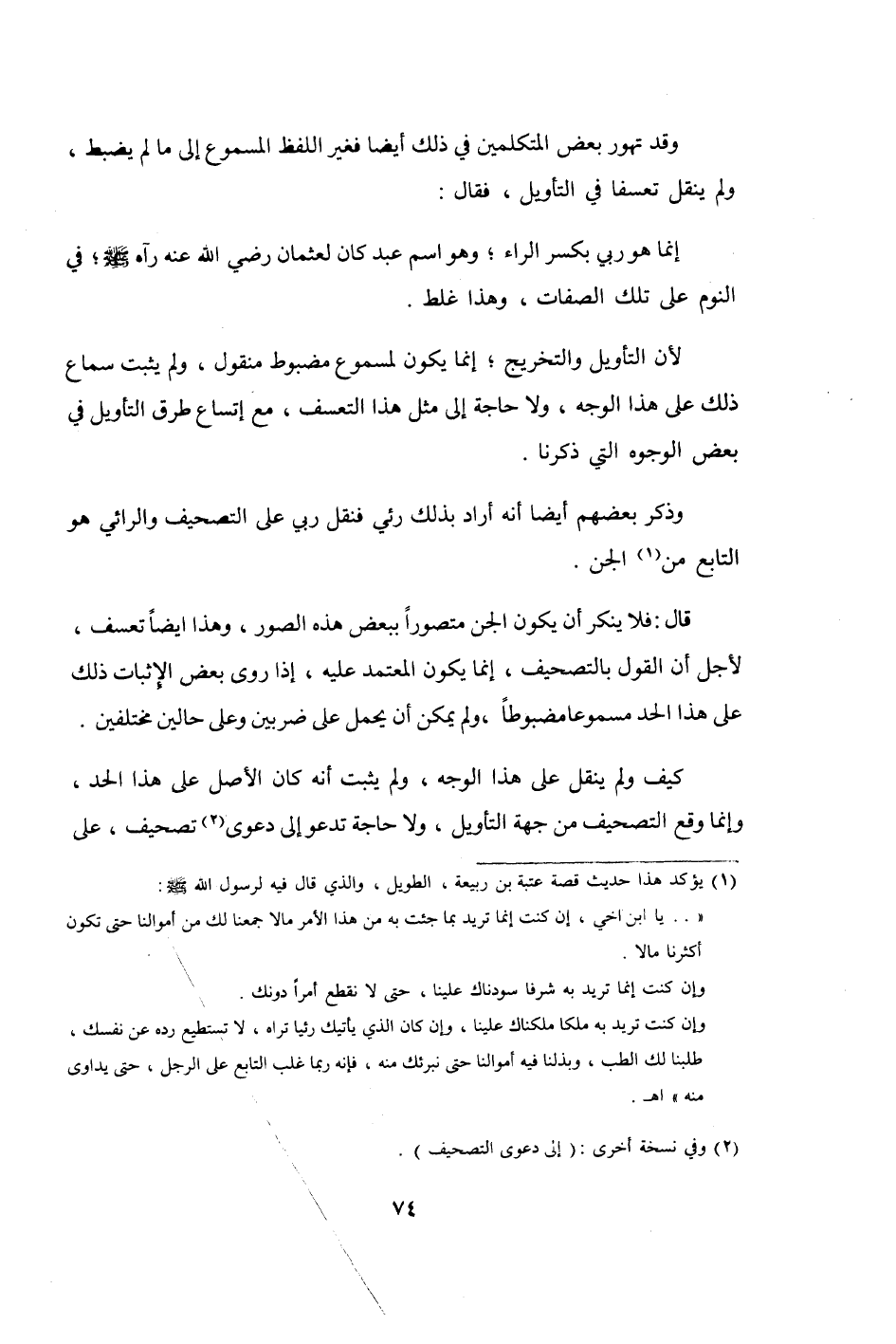 قَالَ فَلَا يُنكر أَن يكون الْجِنّ متصورا بِبَعْض هَذِه الصُّور وَهَذَا أَيْضا تعسف لأجل أَن القَوْل بالتصحيف إِنَّمَا يكون الْمُعْتَمد عَلَيْهِ إِذا روى بعض الْإِثْبَات ذَلِك على هَذَا الْحَد مسموعا مضبوطا وَلم يُمكن أَن يحمل على ضَرْبَيْنِ وعَلى حَالين مُخْتَلفين