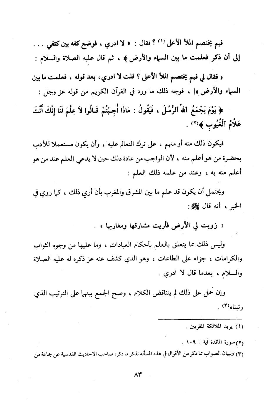 فيمَ يخْتَصم الْمَلأ الْأَعْلَى فَقَالَ لَا أَدْرِي فَوضع كَفه بَين كَتِفي إِلَى أَن ذكر فَعلمت مَا بَين السَّمَاء وَالْأَرْض ثمَّ قَالَ عَلَيْهِ الصَّلَاة وَالسَّلَام