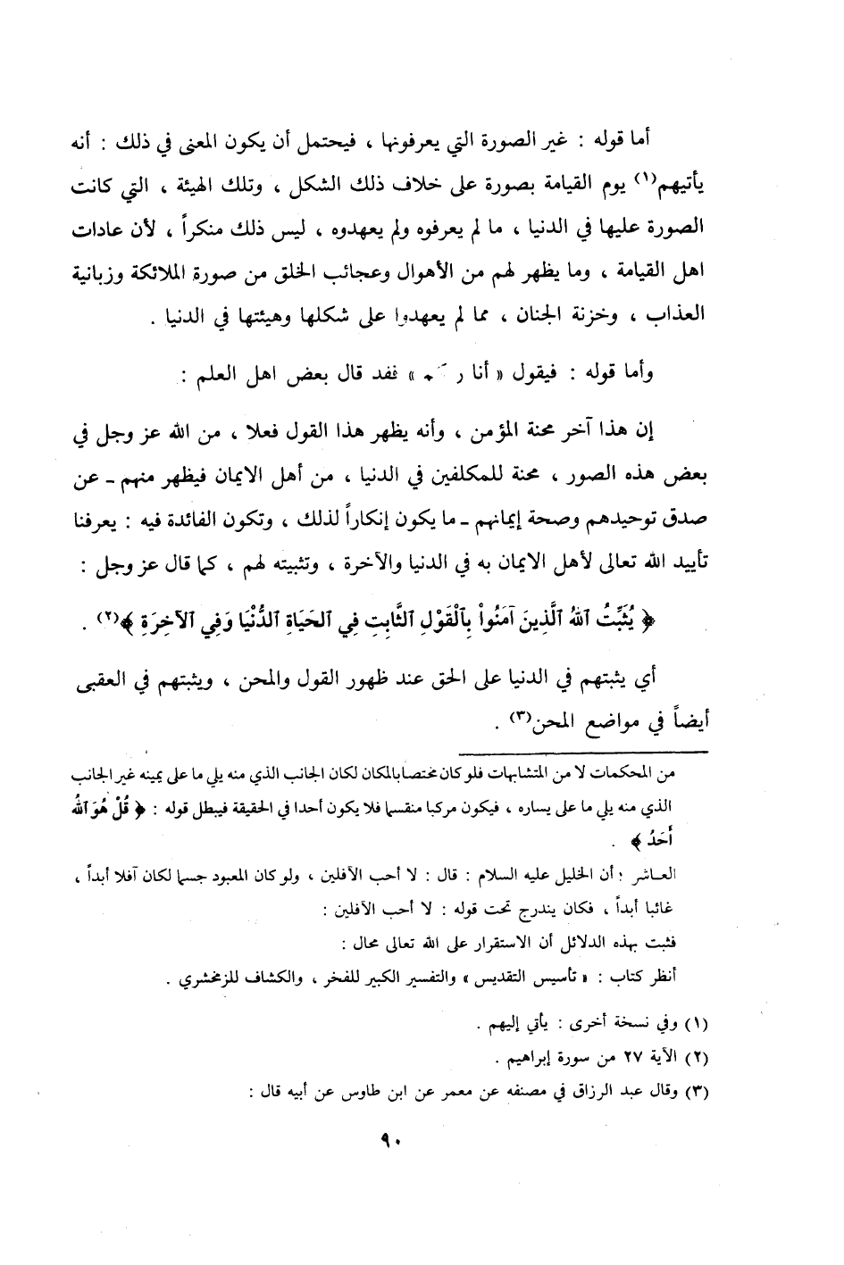إِن هَذَا آخر محنة الْمُؤمن وَأَنه يظْهر هَذَا القَوْل فعلا من الله عز وَجل فِي بعض هَذِه الصُّور محنة للمكلفين فِي الدُّنْيَا من أهل الْإِيمَان فَيظْهر مِنْهُم عَن صدق توحيدهم وَصِحَّة إِيمَانهم مَا يكون إنكارا لذَلِك وَتَكون الْفَائِدَة فِيهِ يعرفنا تأييد الله تَعَالَى لأهل الْإِيمَان بِهِ فِي الدُّنْيَا وَالْآخِرَة وتثبيته لَهُم كَمَا قَالَ عز وَجل