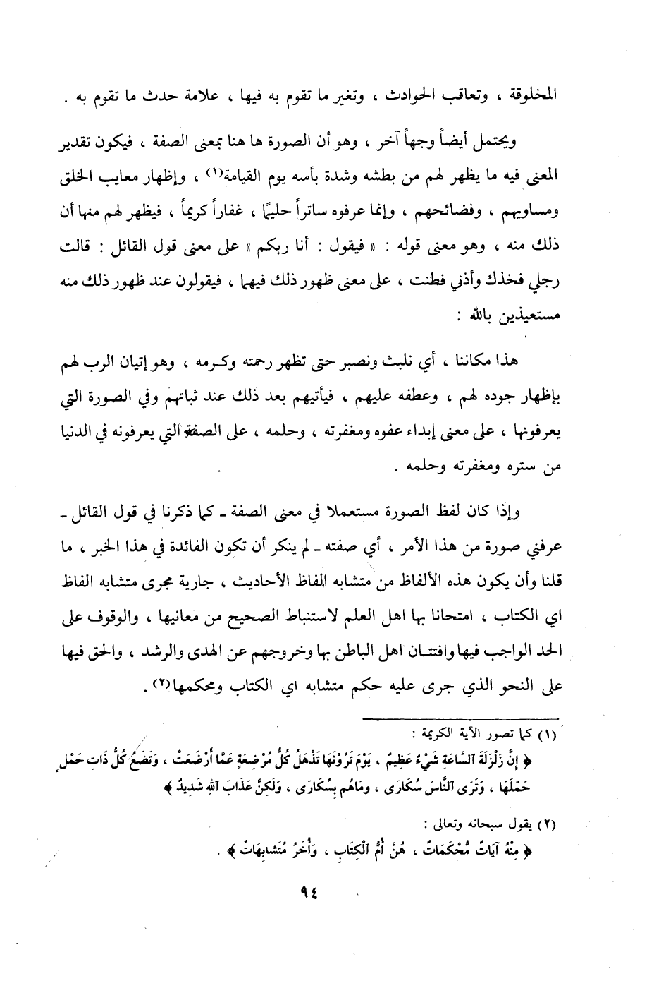 وَإِذا كَانَ لفظ الصُّورَة مُسْتَعْملا فِي معنى الصّفة كَمَا ذكرنَا فِي قَول الْقَائِل عرفني صُورَة من هَذَا الْأَمر أَي صفته لم يُنكر أَن تكون الْفَائِدَة فِي هَذَا الْخَبَر مَا قُلْنَا وَأَن يكون هَذِه الْأَلْفَاظ من متشابه أَلْفَاظ الْأَحَادِيث جَارِيَة مجْرى متشابه أَلْفَاظ أَي الْكتاب امتحانا بهَا أهل الْعلم لإستنباط الصَّحِيح من مَعَانِيهَا وَالْوُقُوف على الْحَد الْوَاجِب فِيهَا وافتتان أهل الْبَاطِن بهَا وخروجهم عَن الْهدى والرشد وَالْحق فِيهَا على النَّحْو الَّذِي جرى عَلَيْهِ حكم متشابه أَي الْكتاب ومحكمها