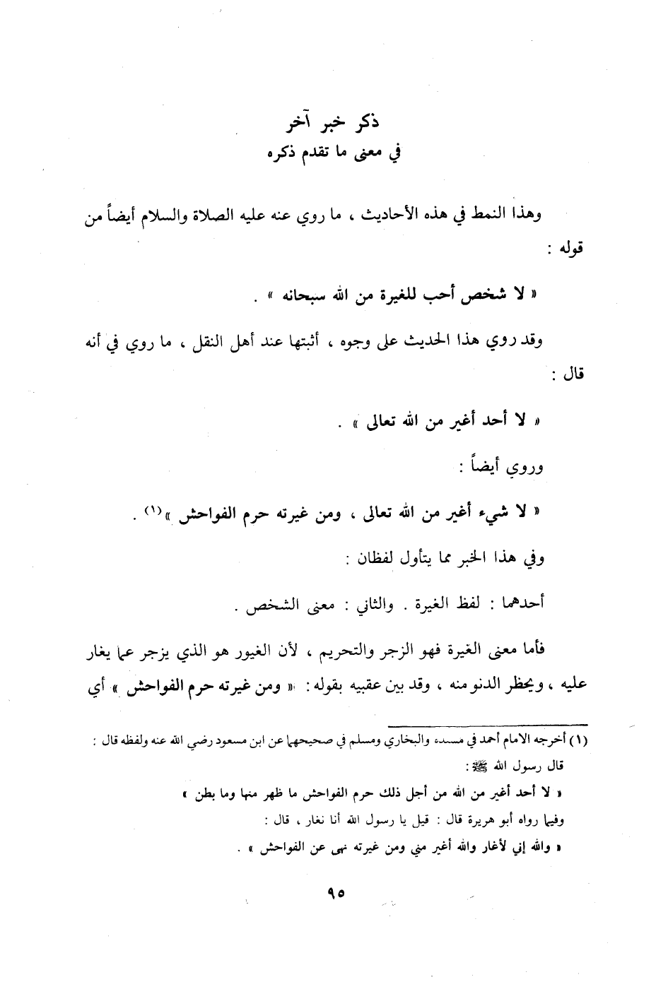 فَأَما معنى الْغيرَة فَهُوَ الزّجر وَالتَّحْرِيم لِأَن الغيور هُوَ الَّذِي يزْجر عَمَّا يغار عَلَيْهِ ويحظر الدنو مِنْهُ وَقد بَين عَقِبَيْهِ بقوله وَمن غيرته حرم الْفَوَاحِش أَي