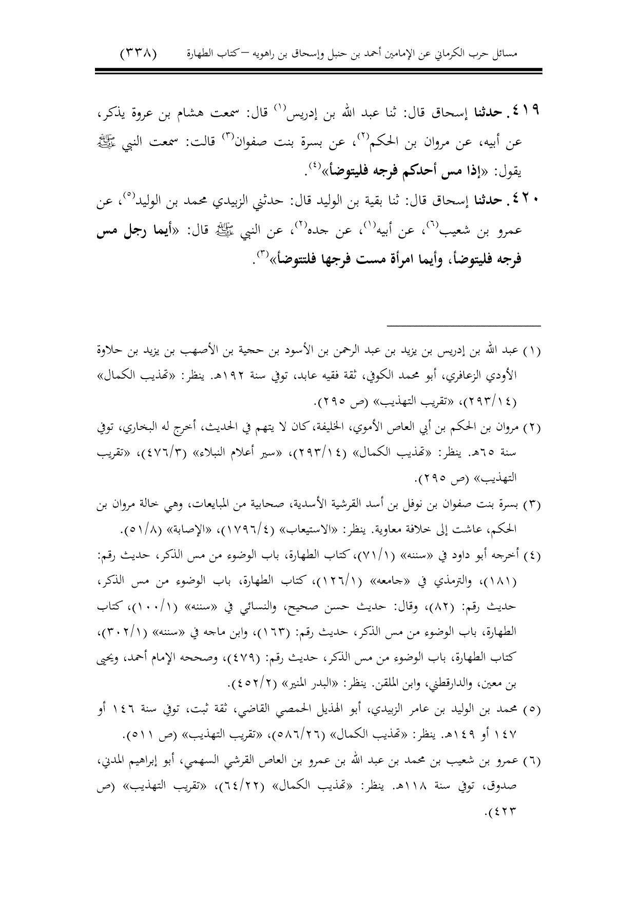 419 - حدثنا إسحاق قال: ثنا عبد الله بن إدريس قال: سمعت هشام بن عروة يذكر، عن أبيه، عن مروان بن الحكم، عن بسرة بنت صفوان قالت: سمعت النبي - صلى الله عليه وسلم - يقول: «إذا مس أحدكم فرجه فليتوضأ».