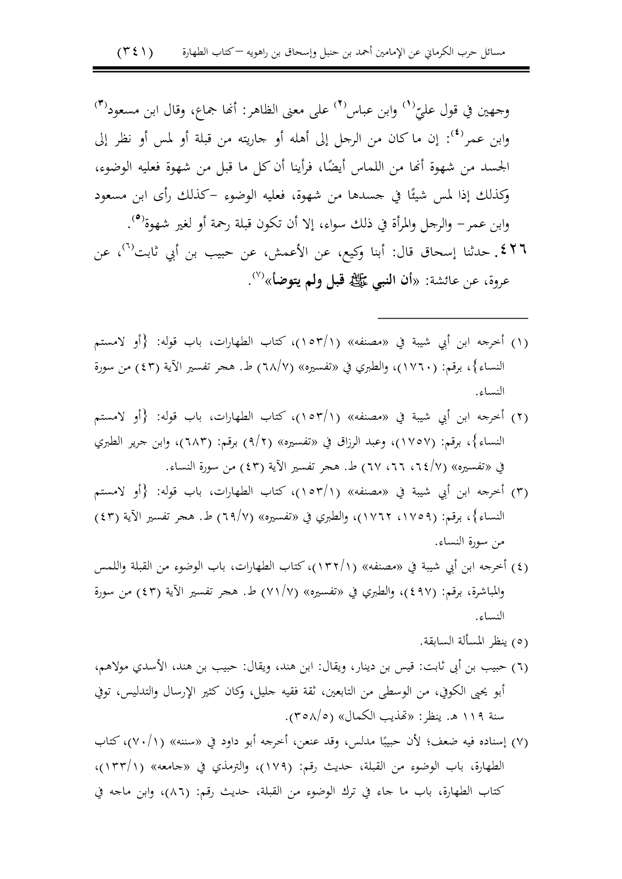 426 - حدثنا إسحاق قال: أبنا وكيع، عن الأعمش، عن حبيب بن أبي ثابت، عن عروة، عن عائشة: «أن النبي - صلى الله عليه وسلم - قبل ولم يتوضأ».
