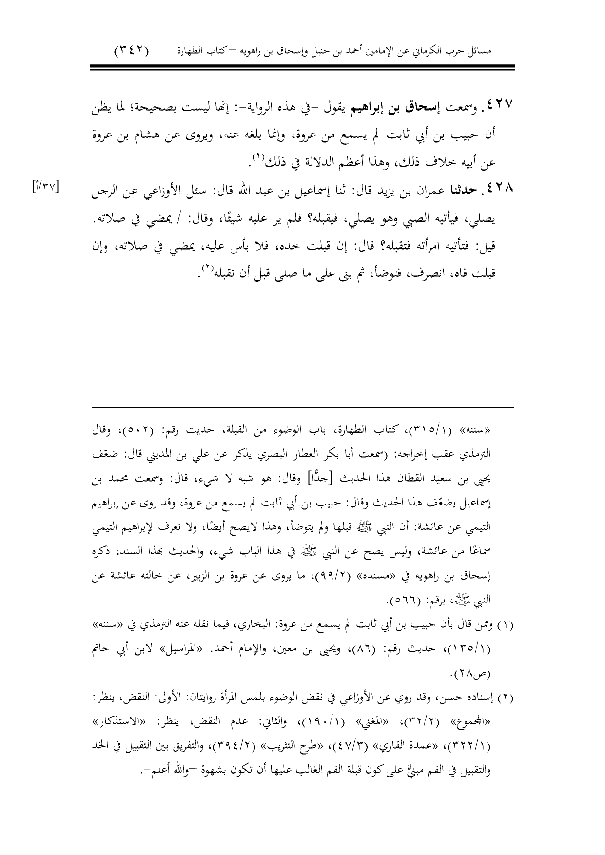 427 - وسمعت إسحاق بن إبراهيم يقول -في هذه الرواية-: إنها ليست بصحيحة؛ لما يظن أن حبيب بن أبي ثابت لم يسمع من عروة، وإنما بلغه عنه، ويروى عن هشام بن عروة عن أبيه خلاف ذلك، وهذا أعظم الدلالة في ذلك.