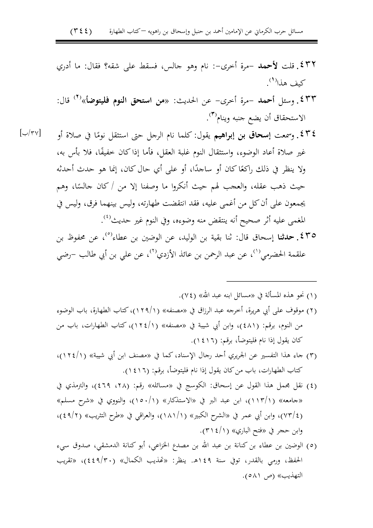 434 - وسمعت إسحاق بن إبراهيم يقول: كلما نام الرجل حتى استثقل نومًا في صلاة أو غير صلاة أعاد الوضوء، واستثقال النوم غلبة العقل، فأما إذا كان خفيفًا، فلا بأس به، ولا ينظر في ذلك راكعًا كان أو ساجدًا، أو على أي حال كان، إنما هو حدث أحدثه حيث ذهب عقله، والعجب لهم حيث أنكروا ما وصفنا إلا من / كان جالسًا، وهم يجمعون على أن كل من أغمى عليه، فقد انتقضت طهارته، وليس بينهما فرق، وليس في المغمى عليه أثر صحيح أنه ينتقض منه وضوءه، وفي النوم غير حديث.