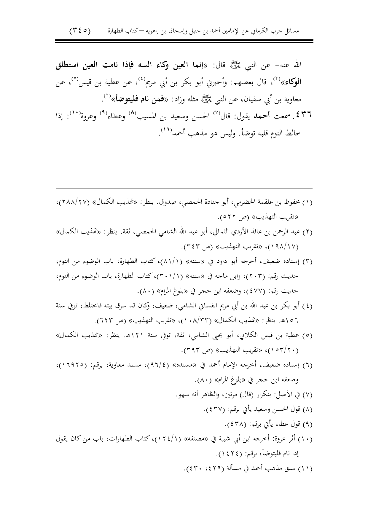 436 - سمعت أحمد يقول: قال الحسن وسعيد بن المسيب وعطاء وعروة: إذا خالط النوم قلبه توضأ. وليس هو مذهب أحمد.