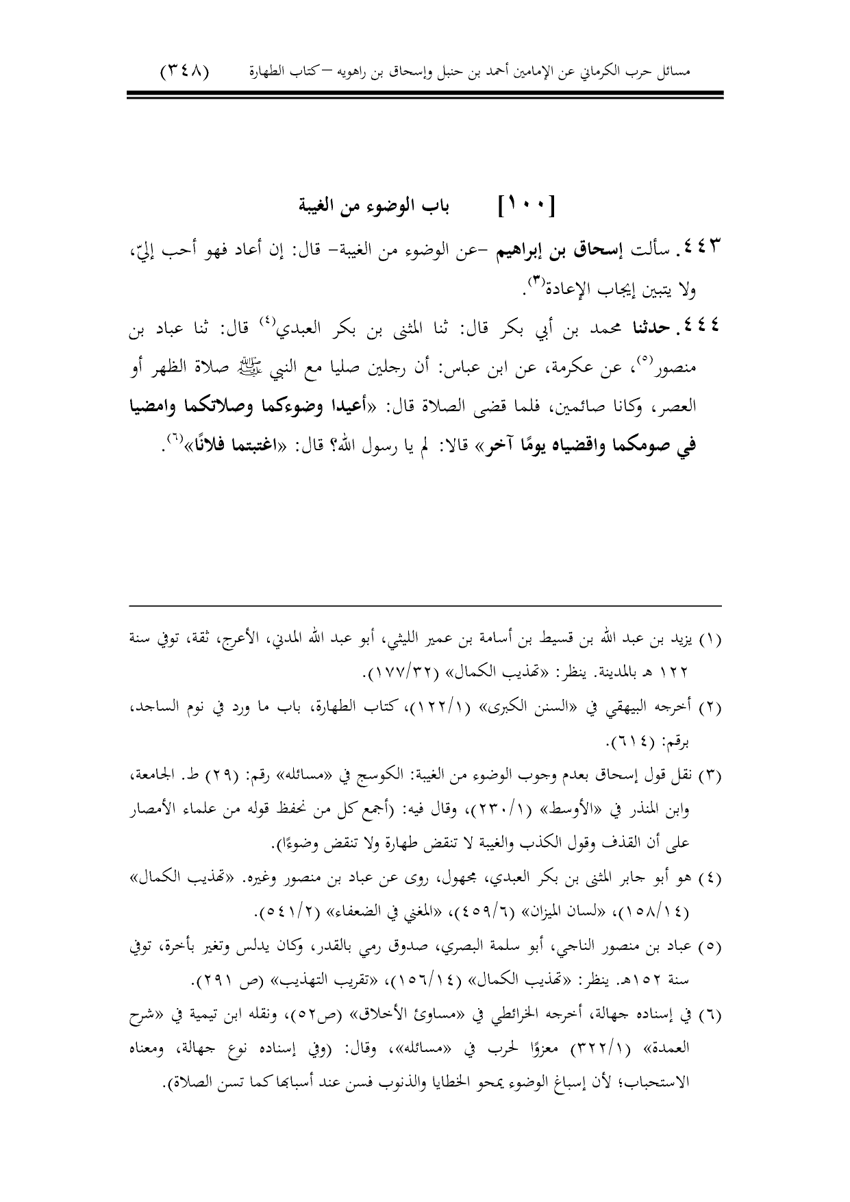 443 - سألت إسحاق بن إبراهيم -عن الوضوء من الغيبة- قال: إن أعاد فهو أحب إليّ، ولا يتبين إيجاب الإعادة.
