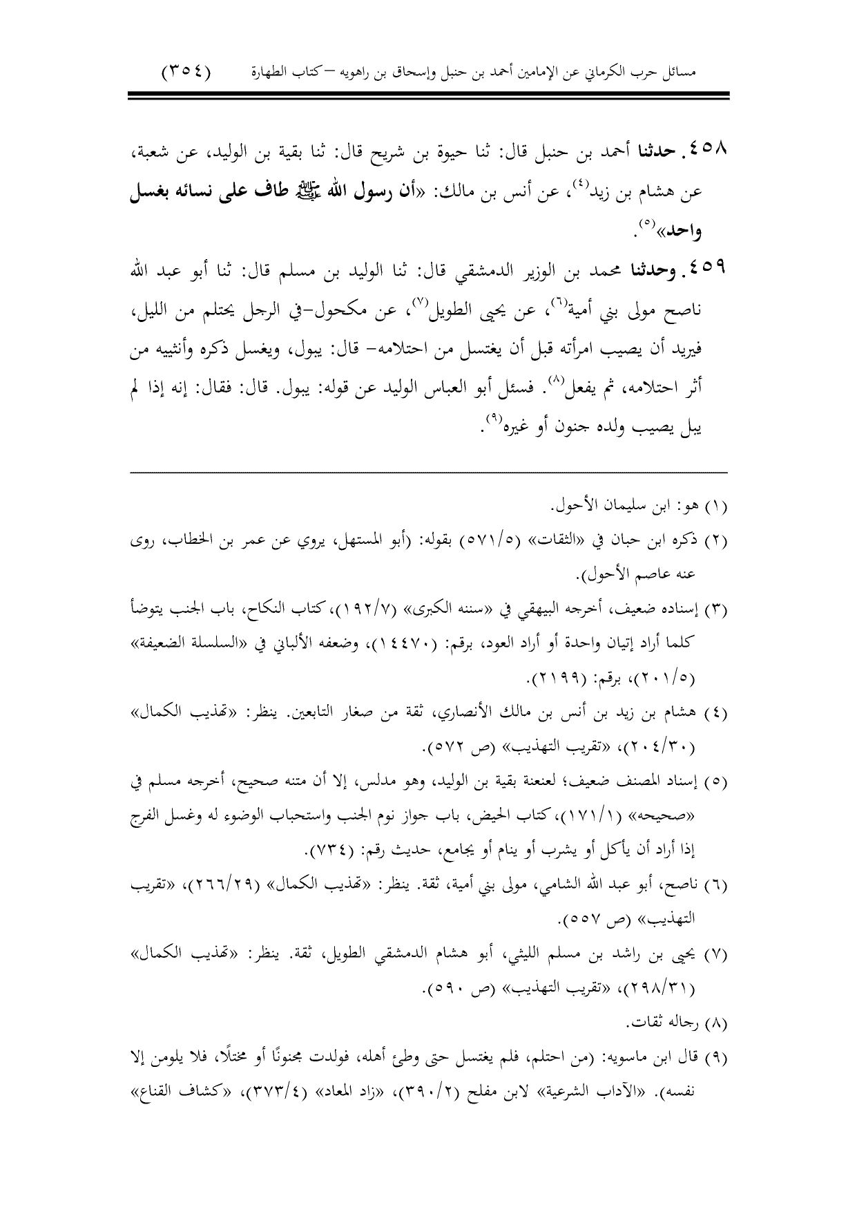 459 - وحدثنا محمد بن الوزير الدمشقي قال: ثنا الوليد بن مسلم قال: ثنا أبو عبد الله ناصح مولى بني أمية، عن يحيى الطويل، عن مكحول-في الرجل يحتلم من الليل، فيريد أن يصيب امرأته قبل أن يغتسل من احتلامه- قال: يبول، ويغسل ذكره وأنثييه من أثر احتلامه، ثم يفعل. فسئل أبو العباس الوليد عن قوله: يبول. قال: فقال: إنه إذا لم يبل يصيب ولده جنون أو غيره.