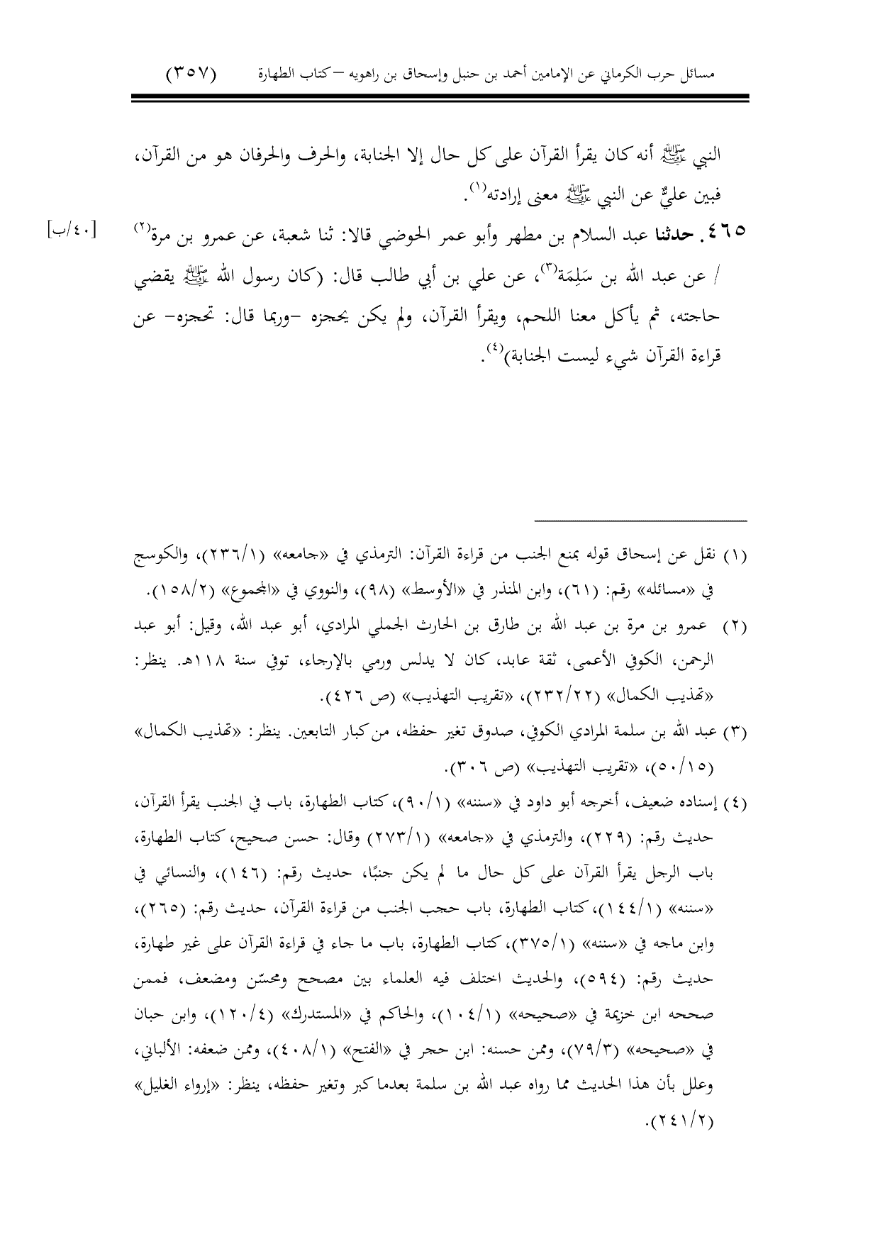 465 - حدثنا عبد السلام بن مطهر وأبو عمر الحوضي قالا: ثنا شعبة، عن عمرو بن مرة / عن عبد الله بن سَلِمَة، عن علي بن أبي طالب قال: (كان رسول الله - صلى الله عليه وسلم - يقضي حاجته، ثم يأكل معنا اللحم، ويقرأ القرآن، ولم يكن يحجزه -وربما قال: تحجزه- عن قراءة القرآن شيء ليست الجنابة).