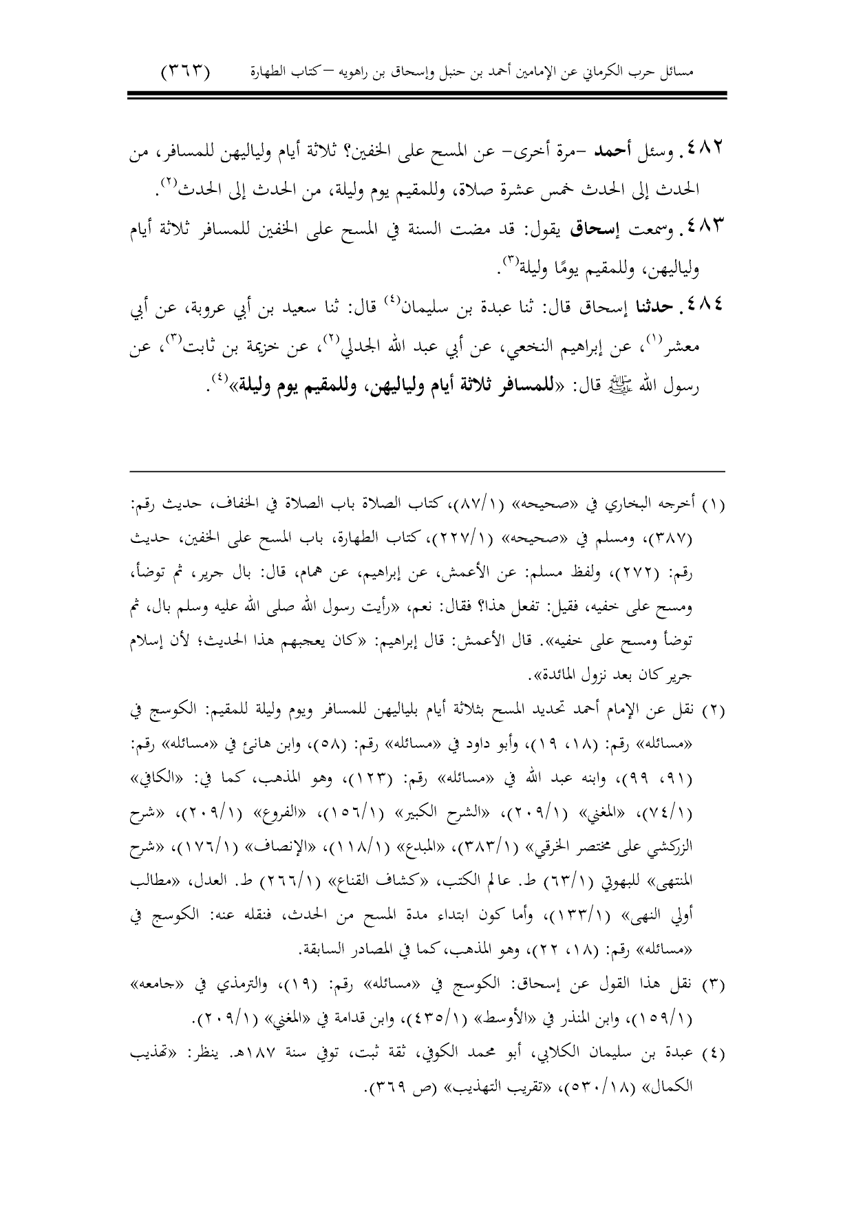 483 - وسمعت إسحاق يقول: قد مضت السنة في المسح على الخفين للمسافر ثلاثة أيام ولياليهن، وللمقيم يومًا وليلة.