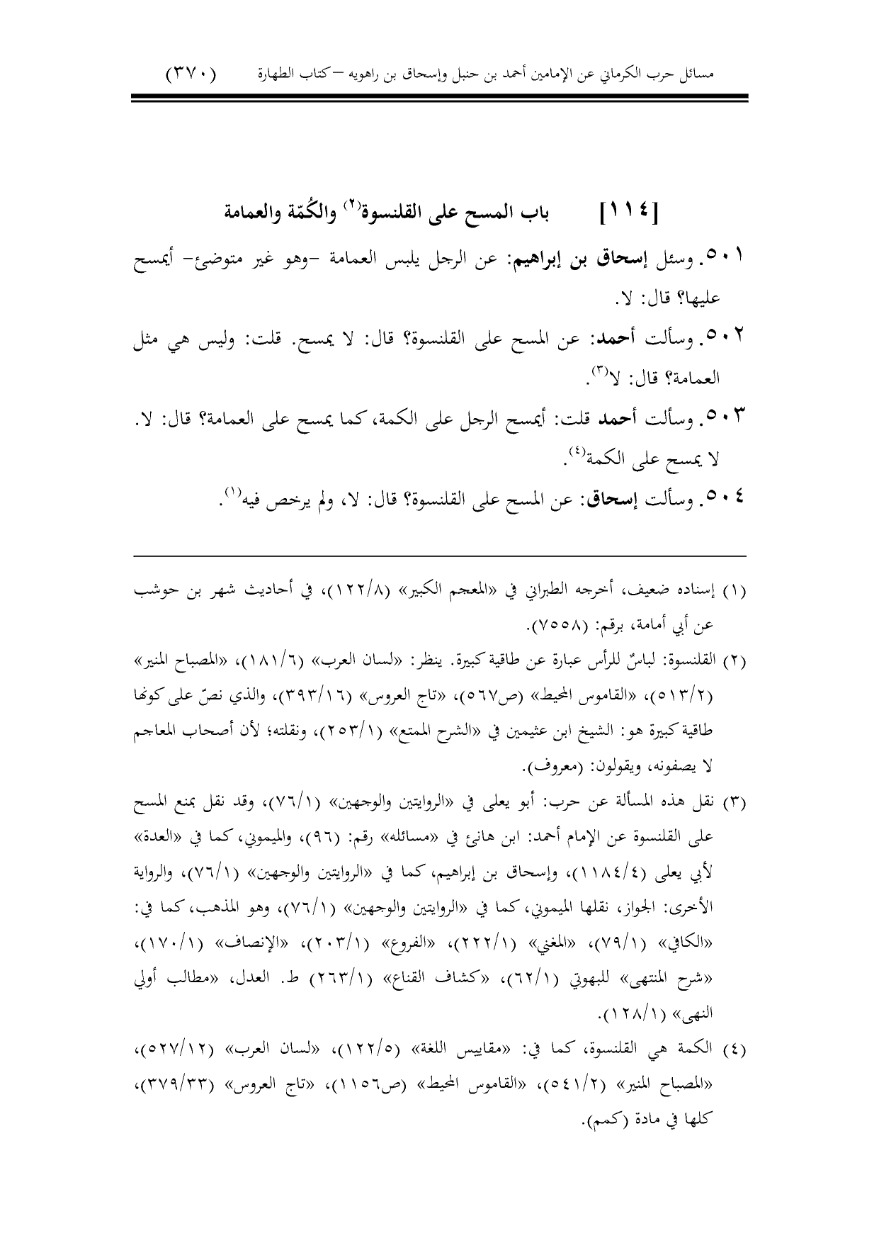 504 - وسألت إسحاق: عن المسح على القلنسوة؟ قال: لا، ولم يرخص فيه.