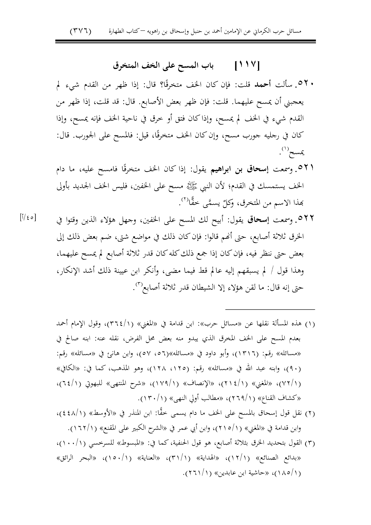 522 - وسمعت إسحاق يقول: أبيح لك المسح على الخفين، وجهل هؤلاء الذين وقتوا في الخرق ثلاثة أصابع، حتى أنهم قالوا: فإن كان ذلك في مواضع شتى، ضم بعض ذلك إلى بعض حتى ننظر فيه، فإن كان إذا جمع ذلك كله كان قدر ثلاثة أصابع لم يمسح عليهما، وهذا قول / لم يسبقهم إليه عالم قط فيما مضى، وأنكر ابن عيينة ذلك أشد الإنكار، حتى إنه قال: ما لقن هؤلاء إلا الشيطان قدر ثلاثة أصابع.