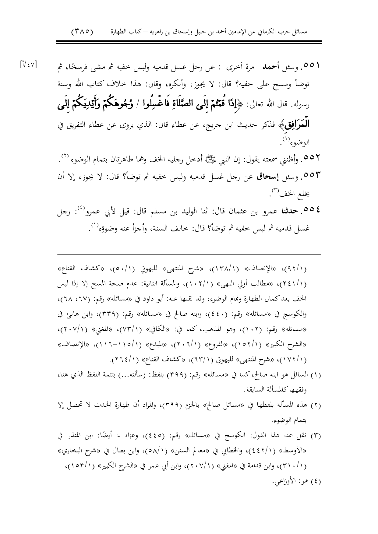 553 - وسئل إسحاق عن رجل غسل قدميه ولبس خفيه ثم توضأ؟ قال: لا يجوز، إلا أن يخلع الخف.