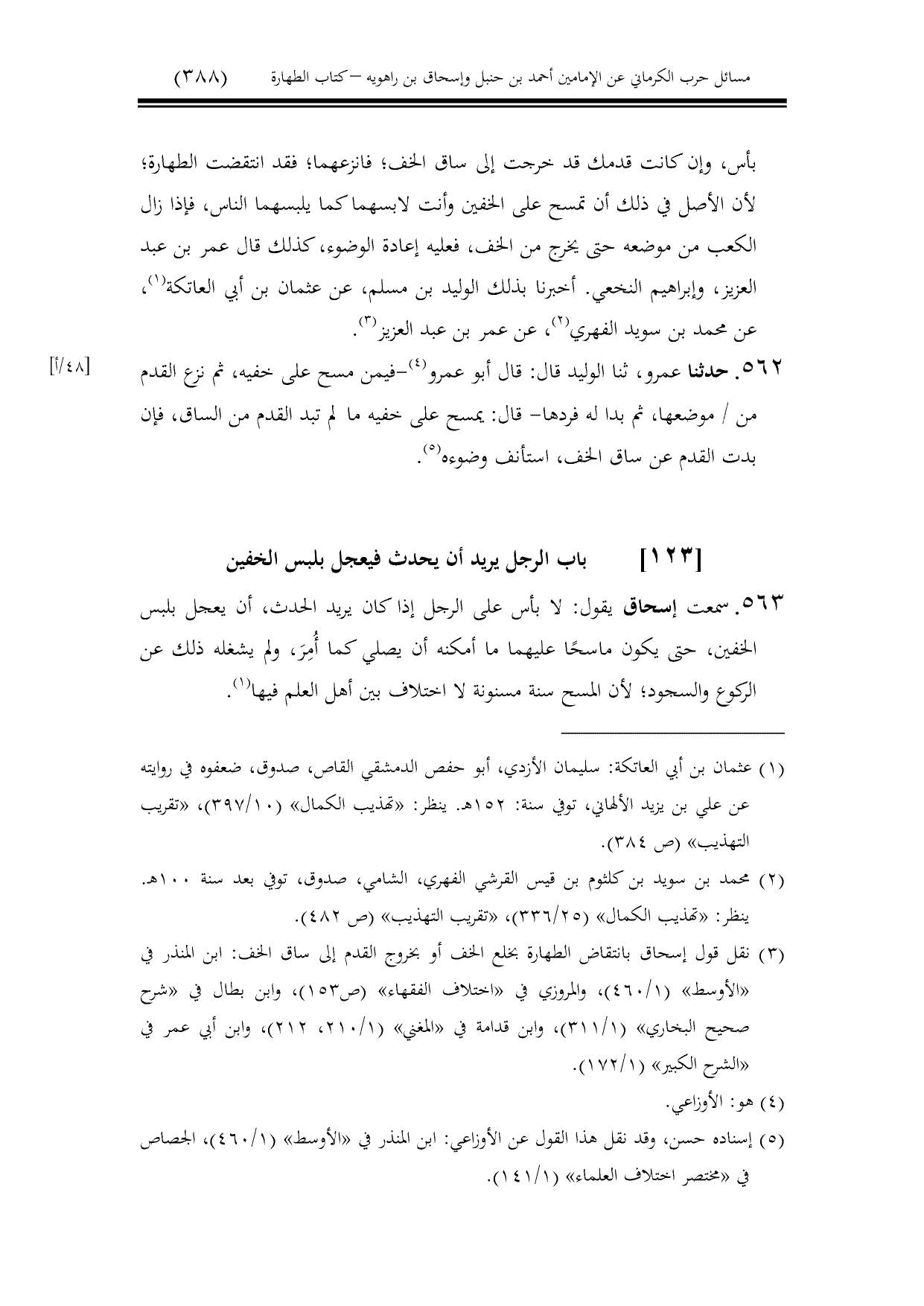 562 - حدثنا عمرو، ثنا الوليد قال: قال أبو عمرو-فيمن مسح على خفيه، ثم نزع القدم من / موضعها، ثم بدا له فردها- قال: يمسح على خفيه ما لم تبد القدم من الساق، فإن بدت القدم عن ساق الخف، استأنف وضوءه.