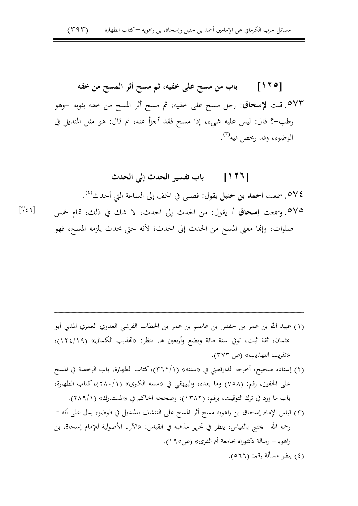575 - وسمعت إسحاق / يقول: من الحدث إلى الحدث، لا شك في ذلك، تمام خمس صلوات، وإنما معنى المسح من الحدث إلى الحدث؛ لأنه حتى يحدث يلزمه المسح، فهو