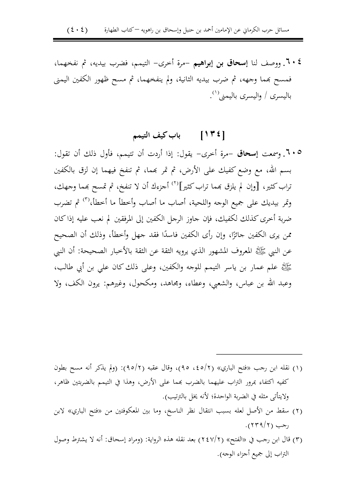 604 - ووصف لنا إسحاق بن إبراهيم -مرة أخرى- التيمم، فضرب بيديه، ثم نفخهما، فمسح بهما وجهه، ثم ضرب بيديه الثانية، ولم ينفخهما، ثم مسح ظهور الكفين اليمنى باليسرى / واليسرى باليمنى.