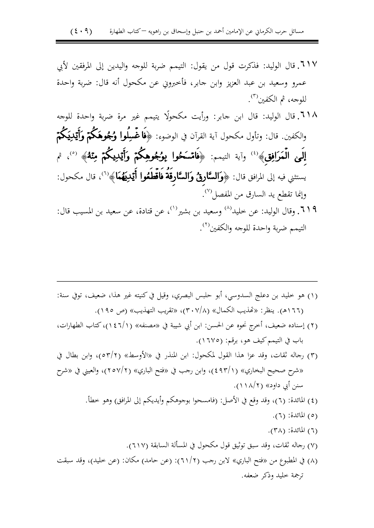 618 - قال الوليد: قال ابن جابر: ورأيت مكحولًا يتيمم غير مرة ضربة واحدة للوجه والكفين. قال: وتأول مكحول آية القرآن في الوضوء: {فَاغْسِلُوا وُجُوهَكُمْ وَأَيْدِيَكُمْ إِلَى الْمَرَافِقِ} وآية التيمم: {فَامْسَحُوا بِوُجُوهِكُمْ وَأَيْدِيكُمْ مِنْهُ}، ثم يستثني فيه إلى المرافق قال: {وَالسَّارِقُ وَالسَّارِقَةُ فَاقْطَعُوا أَيْدِيَهُمَا}، قال مكحول: وإنما تقطع يد السارق من المفصل.