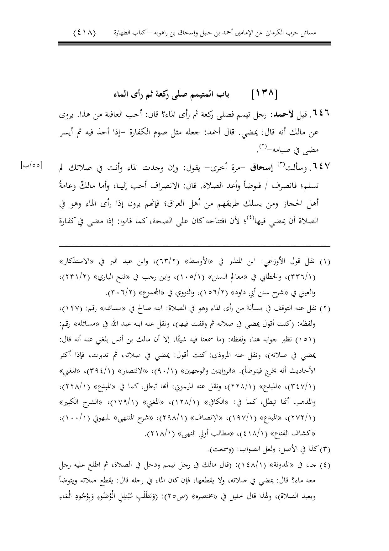 647 - وسألت إسحاق -مرة أخرى- يقول: وإن وجدت الماء وأنت في صلاتك لم تسلم؛ فانصرف / فتوضأ وأعد الصلاة. قال: الانصراف أحب إلينا، وأما مالكٌ وعامةُ أهل الحجاز ومن يسلك طريقهم من أهل العراق؛ فإنهم يرون إذا رأى الماء وهو في الصلاة أن يمضي فيها؛ لأن افتتاحه كان على الصحة، كما قالوا: إذا مضى في كفارة