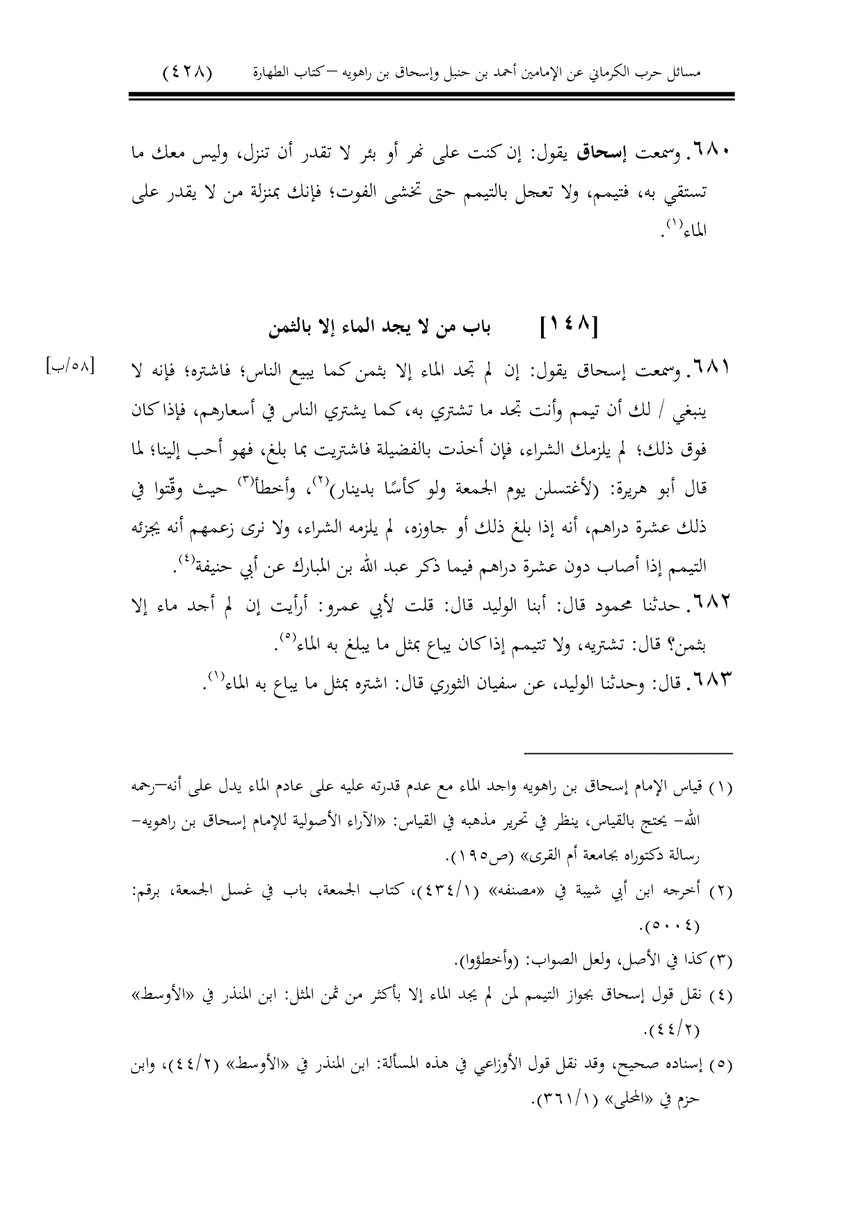 681 - وسمعت إسحاق يقول: إن لم تجد الماء إلا بثمن كما يبيع الناس؛ فاشتره؛ فإنه لا ينبغي / لك أن تيمم وأنت تجد ما تشتري به، كما يشتري الناس في أسعارهم، فإذا كان فوق ذلك؛ لم يلزمك الشراء، فإن أخذت بالفضيلة فاشتريت بما بلغ، فهو أحب إلينا؛ لما قال أبو هريرة: (لأغتسلن يوم الجمعة ولو كأسًا بدينار)، وأخطأ حيث وقّتوا في ذلك عشرة دراهم، أنه إذا بلغ ذلك أو جاوزه، لم يلزمه الشراء، ولا نرى زعمهم أنه يجزئه التيمم إذا أصاب دون عشرة دراهم فيما ذكر عبد الله بن المبارك عن أبي حنيفة.