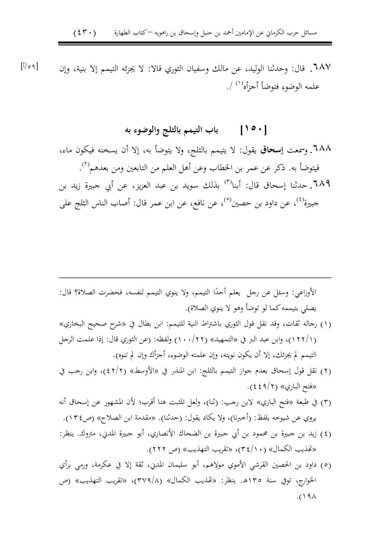 688 - وسمعت إسحاق يقول: لا يتيمم بالثلج، ولا يتوضأ به، إلا أن يسخنه فيكون ماء، فيتوضأ به. ذكر عن عمر بن الخطاب وعن أهل العلم من التابعين ومن بعدهم.