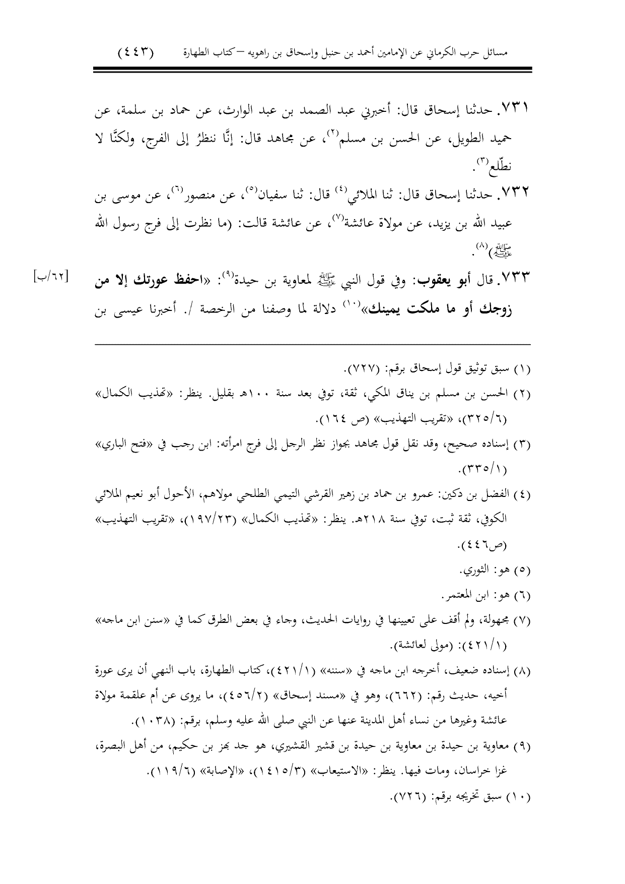 733 - قال أبو يعقوب: وفي قول النبي - صلى الله عليه وسلم - لمعاوية بن حيدة: «احفظ عورتك إلا من زوجك أو ما ملكت يمينك» دلالة لما وصفنا من الرخصة /. أخبرنا عيسى بن