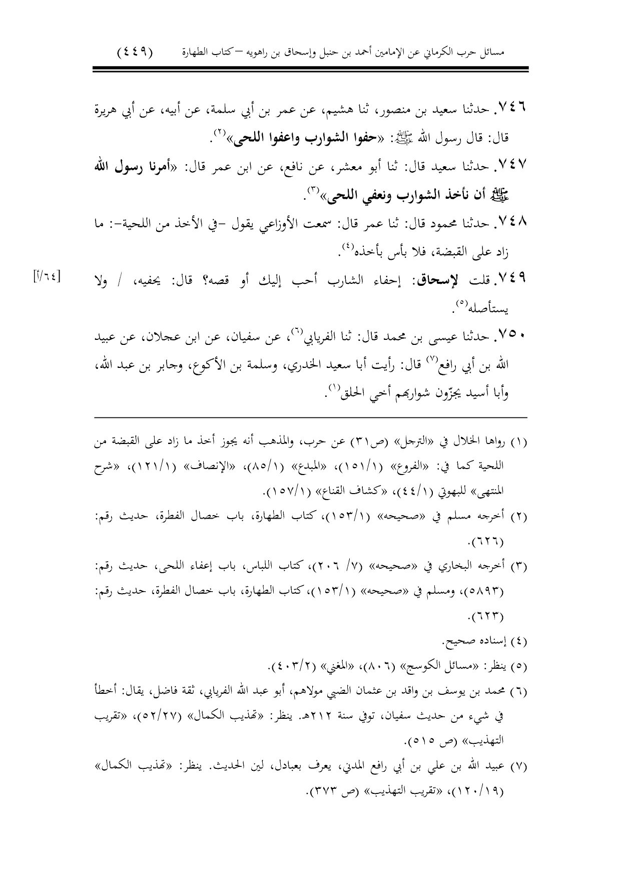 749 - قلت لإسحاق: إحفاء الشارب أحب إليك أو قصه؟ قال: يحفيه، / ولا يستأصله.