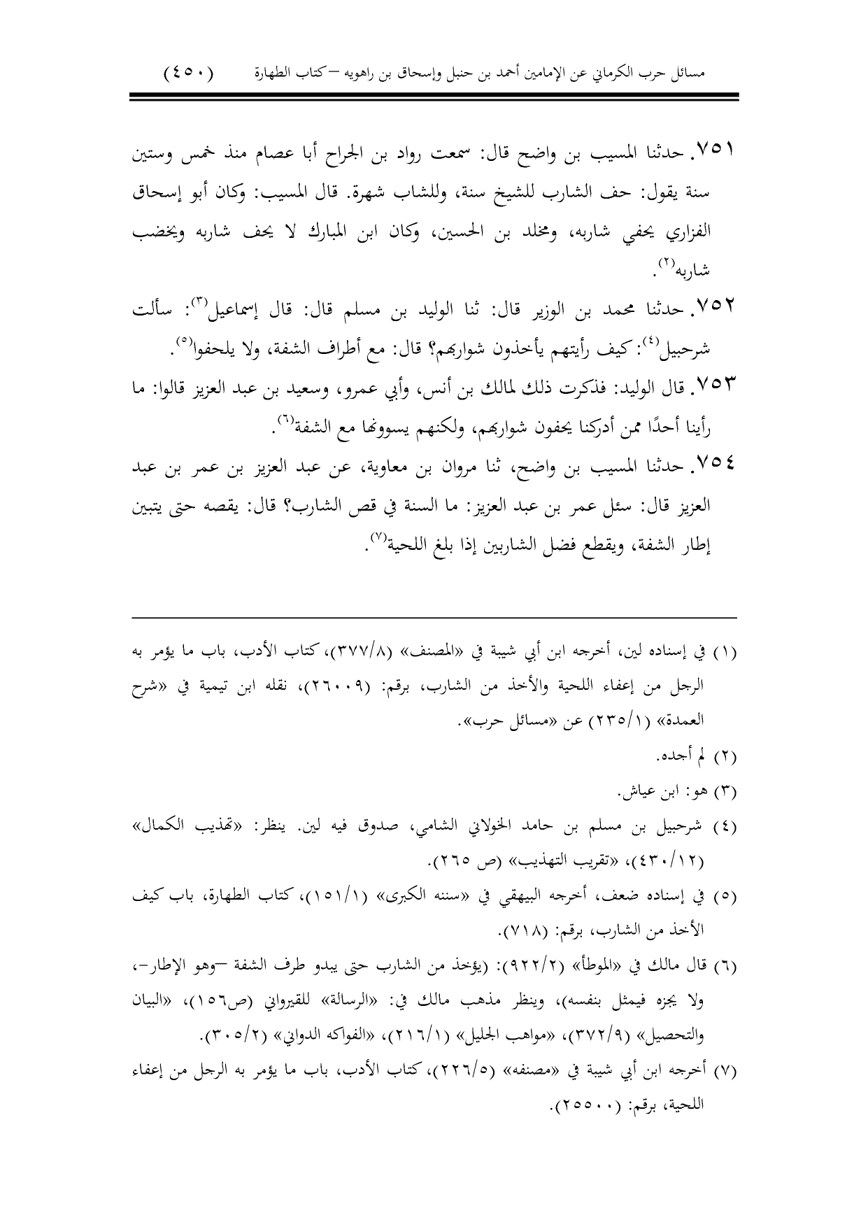 752 - حدثنا محمد بن الوزير قال: ثنا الوليد بن مسلم قال: قال إسماعيل: سألت شرحبيل: كيف رأيتهم يأخذون شواربهم؟ قال: مع أطراف الشفة، ولا يلحفوا.