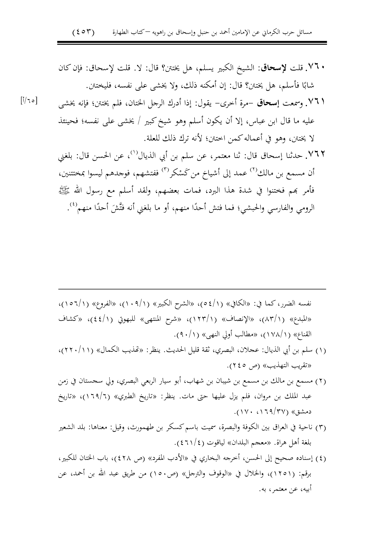 762 - حدثنا إسحاق قال: ثنا معتمر، عن سلم بن أبي الذيال، عن الحسن قال: بلغني أن مسمع بن مالك عمد إلى أشياخ من كَسْكر ففتشهم، فوجدهم ليسوا بمختتنين، فأمر بهم فختنوا في شدة هذا البرد، فمات بعضهم، ولقد أسلم مع رسول الله - صلى الله عليه وسلم - الرومي والفارسي والحبشي؛ فما فتش أحدًا منهم، أو ما بلغني أنه فتَّشَ أحدًا منهم.