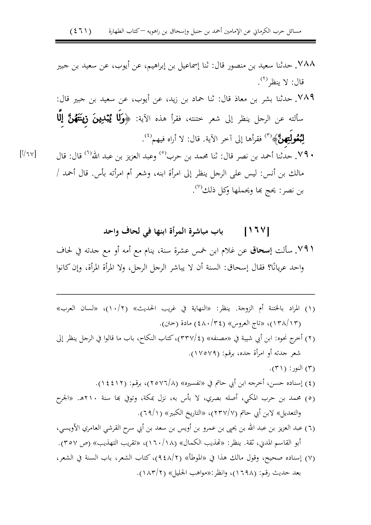 791 - سألت إسحاق عن غلام ابن خمس عشرة سنة، ينام مع أمه أو مع جدته في لحاف واحد عريانًا؟ فقال إسحاق: السنة أن لا يباشر الرجل الرجل، ولا المرأة المرأة، وإن كانوا