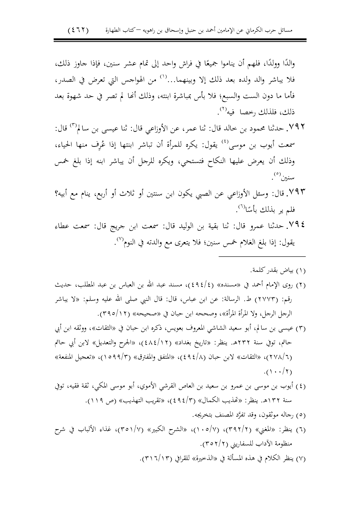 792 - حدثنا محمود بن خالد قال: ثنا عمر، عن الأوزاعي قال: ثنا عيسى بن سالم قال: سمعت أيوب بن موسى يقول: يكره للمرأة أن تباشر ابنتها إذا عُرِف منها الحياء، وذلك أن يعرض عليها النكاح فتستحي، ويكره للرجل أن يباشر ابنه إذا بلغ خمس سنين.