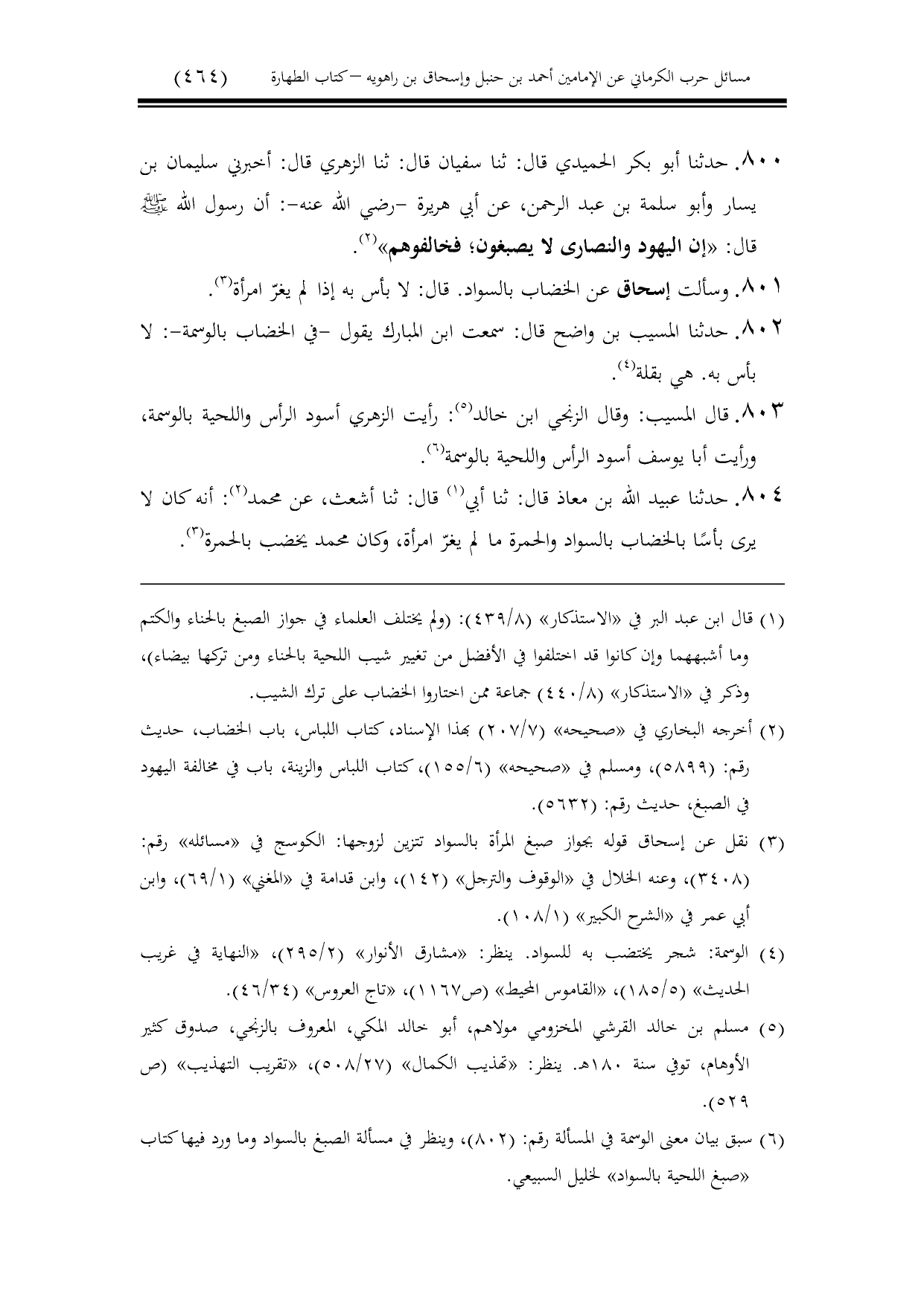 800 - حدثنا أبو بكر الحميدي قال: ثنا سفيان قال: ثنا الزهري قال: أخبرني سليمان بن يسار وأبو سلمة بن عبد الرحمن، عن أبي هريرة -رضي الله عنه-: أن رسول الله - صلى الله عليه وسلم - قال: «إن اليهود والنصارى لا يصبغون؛ فخالفوهم».