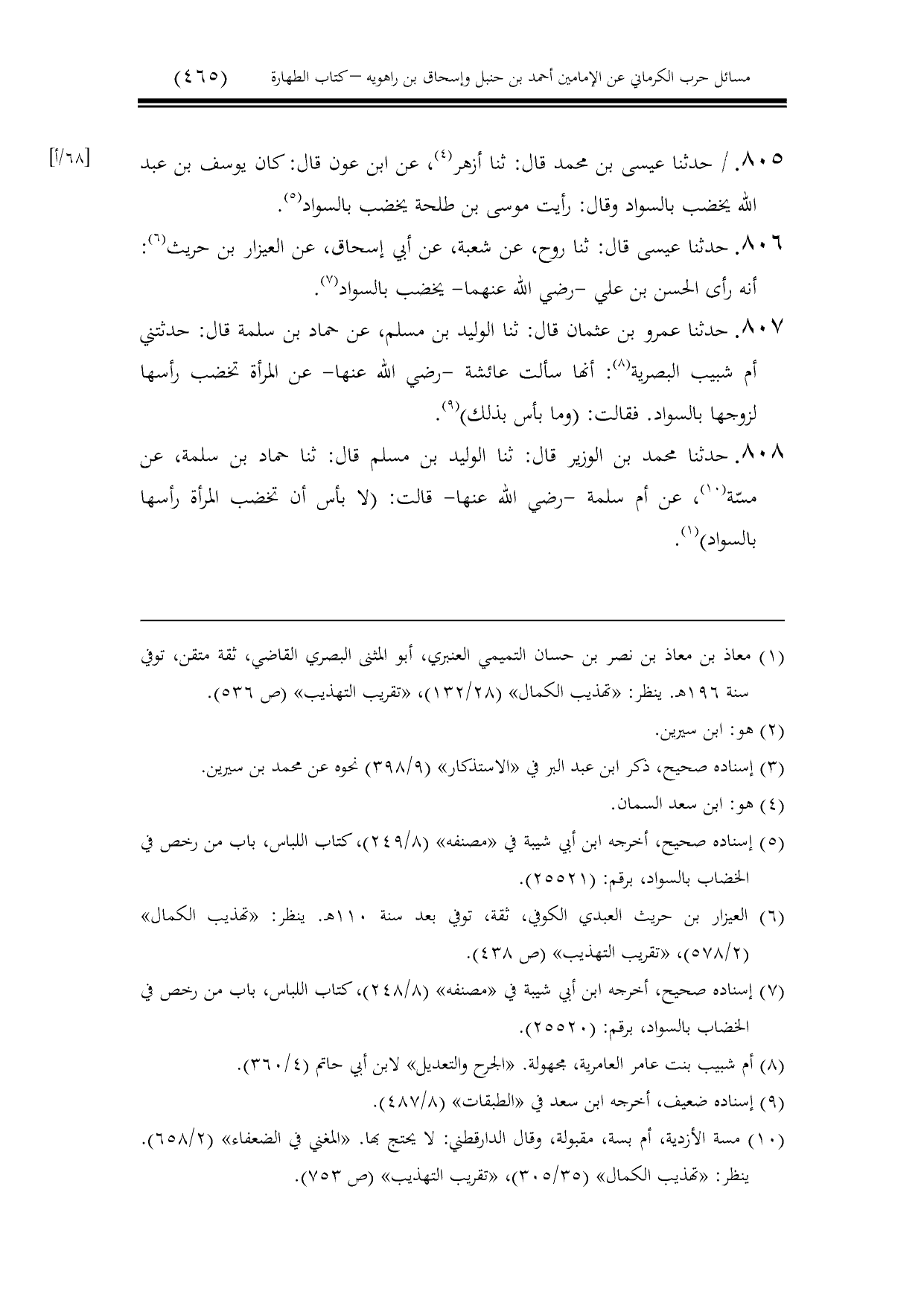 805 - / حدثنا عيسى بن محمد قال: ثنا أزهر، عن ابن عون قال: كان يوسف بن عبد الله يخضب بالسواد وقال: رأيت موسى بن طلحة يخضب بالسواد.