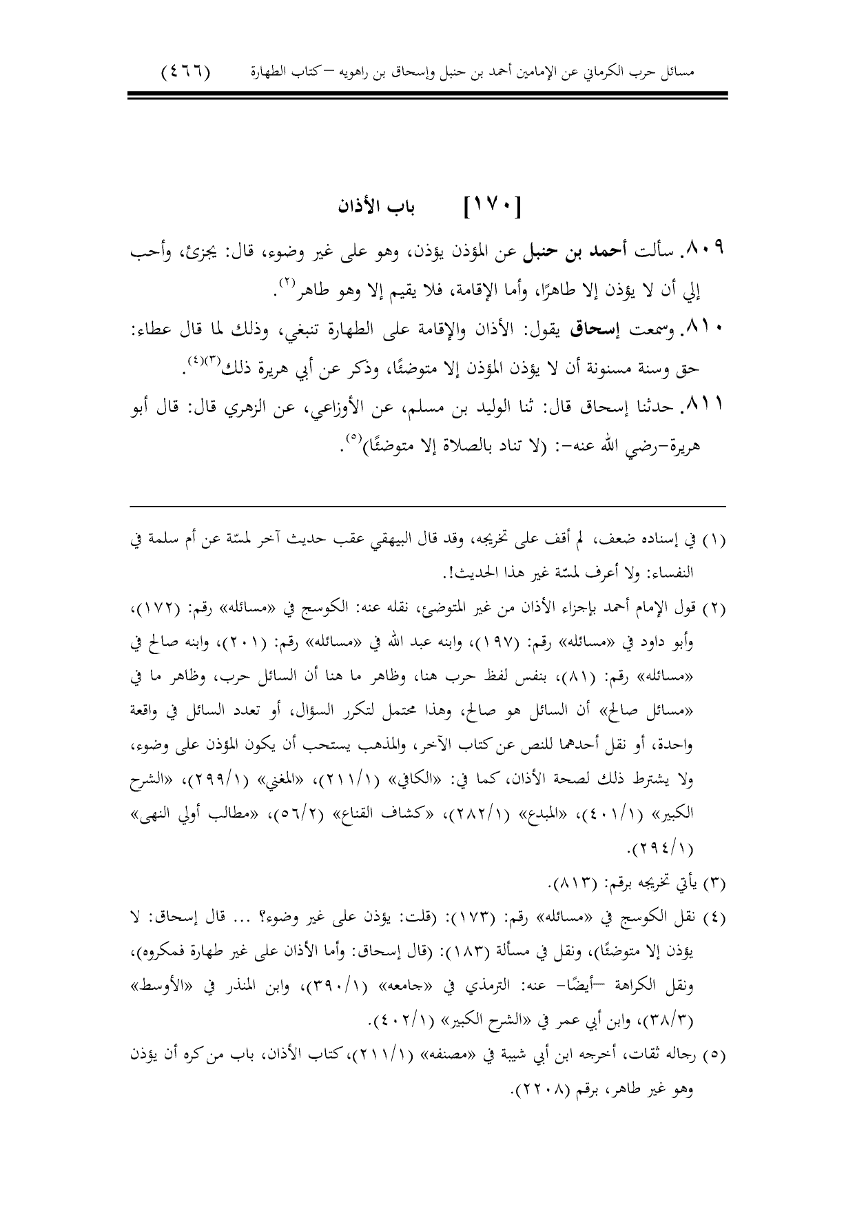 810 - وسمعت إسحاق يقول: الأذان والإقامة على الطهارة تنبغي، وذلك لما قال عطاء: حق وسنة مسنونة أن لا يؤذن المؤذن إلا متوضئًا، وذكر عن أبي هريرة ذلك.