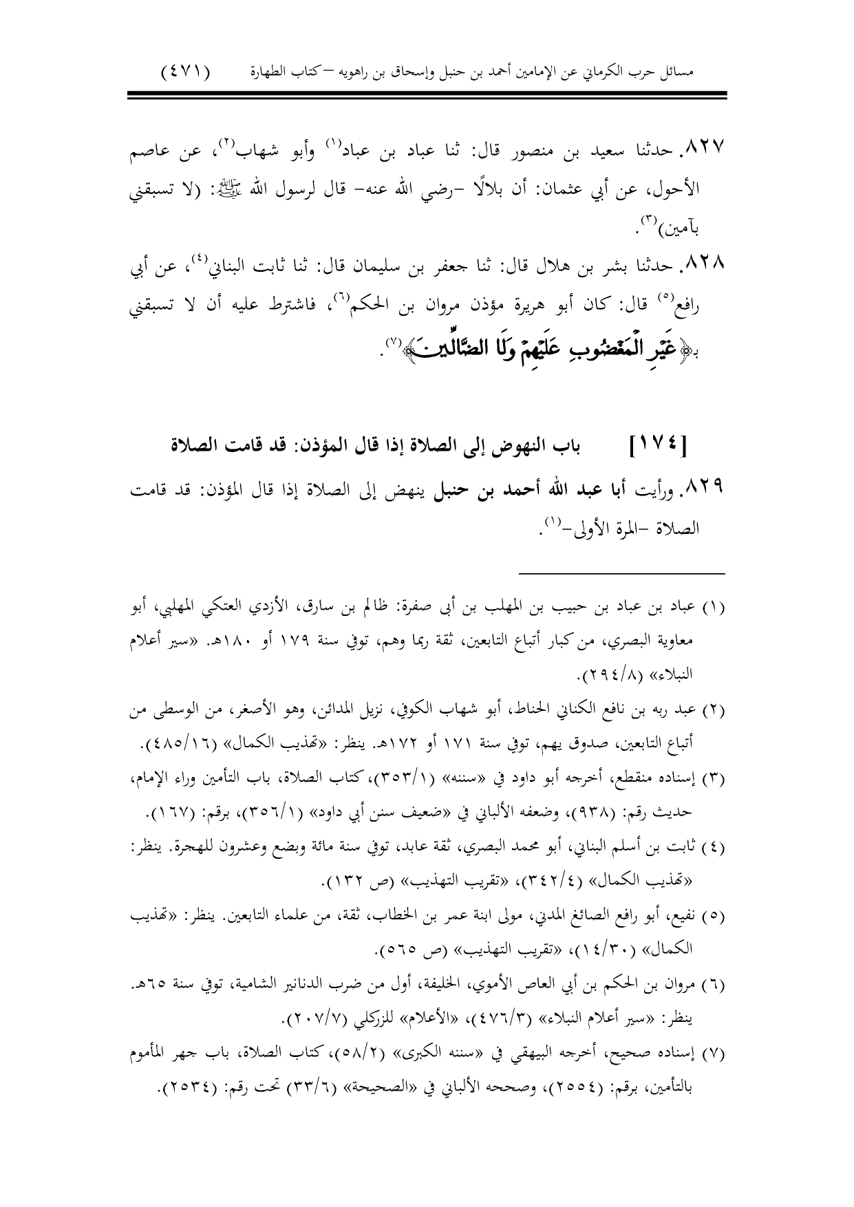 829 - ورأيت أبا عبد الله أحمد بن حنبل ينهض إلى الصلاة إذا قال المؤذن: قد قامت الصلاة -المرة الأولى-.