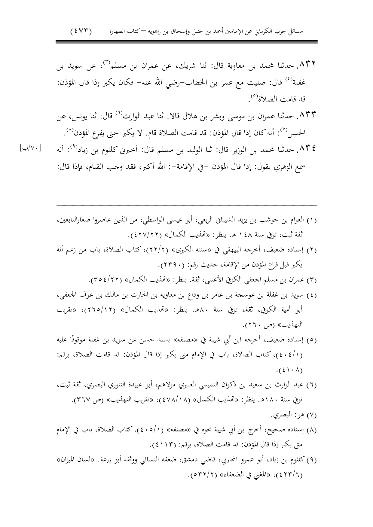832 - حدثنا محمد بن معاوية قال: ثنا شريك، عن عمران بن مسلم، عن سويد بن غفلة قال: صليت مع عمر بن الخطاب-رضي الله عنه- فكان يكبر إذا قال المؤذن: قد قامت الصلاة.