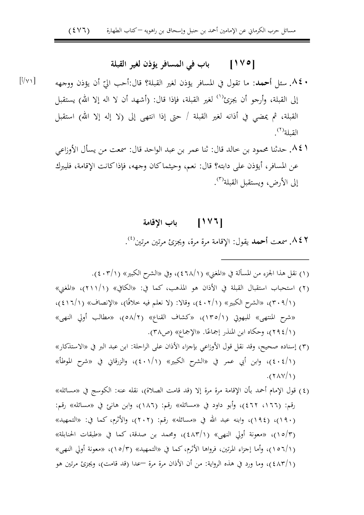 840 - سئل أحمد: ما تقول في المسافر يؤذن لغير القبلة؟ قال: أحب اليّ أن يؤذن ووجهه إلى القبلة، وأرجو أن يجزئ لغير القبلة، فإذا قال: (أشهد أن لا اله إلا الله) يستقبل القبلة، ثم يمضي في أذانه لغير القبلة / حتى إذا انتهى إلى (لا إله إلا الله) استقبل القبلة.