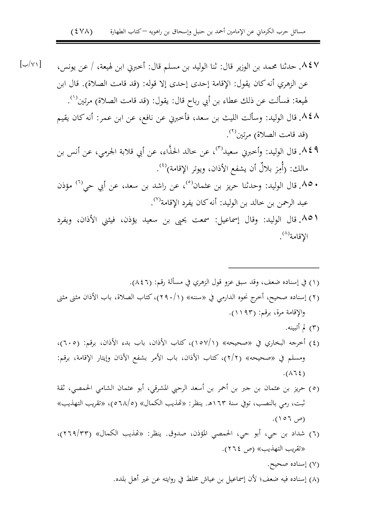 850 - قال الوليد: وحدثنا حريز بن عثمان، عن راشد بن سعد، عن أبي حي مؤذن عبد الرحمن بن خالد بن الوليد: أنه كان يفرد الإقامة.