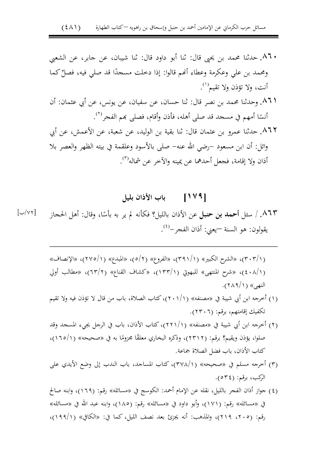 863 - / سئل أحمد بن حنبل عن الأذان بالليل؟ فكأنه لم ير به بأسًا، وقال: أهل الحجاز يقولون: هو السنة -يعني: أذان الفجر-.