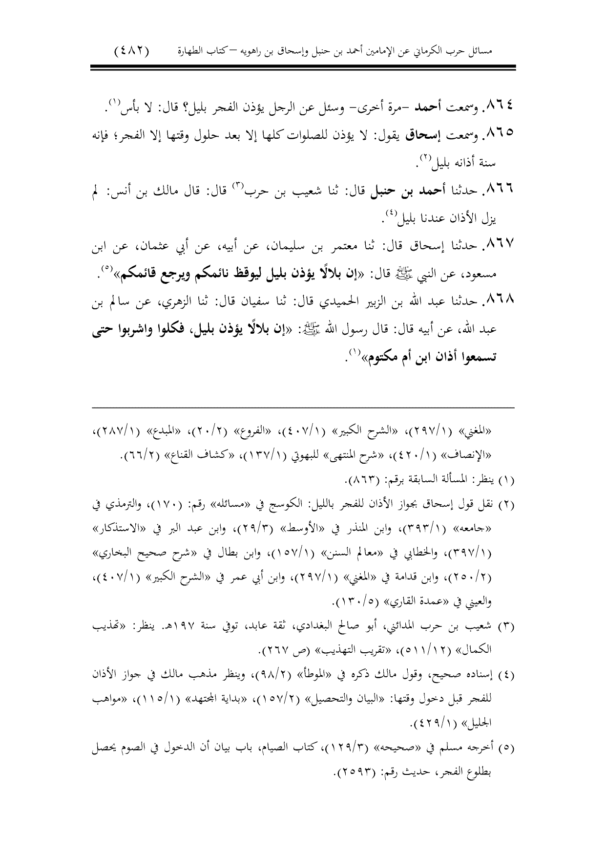 865 - وسمعت إسحاق يقول: لا يؤذن للصلوات كلها إلا بعد حلول وقتها إلا الفجر؛ فإنه سنة أذانه بليل.