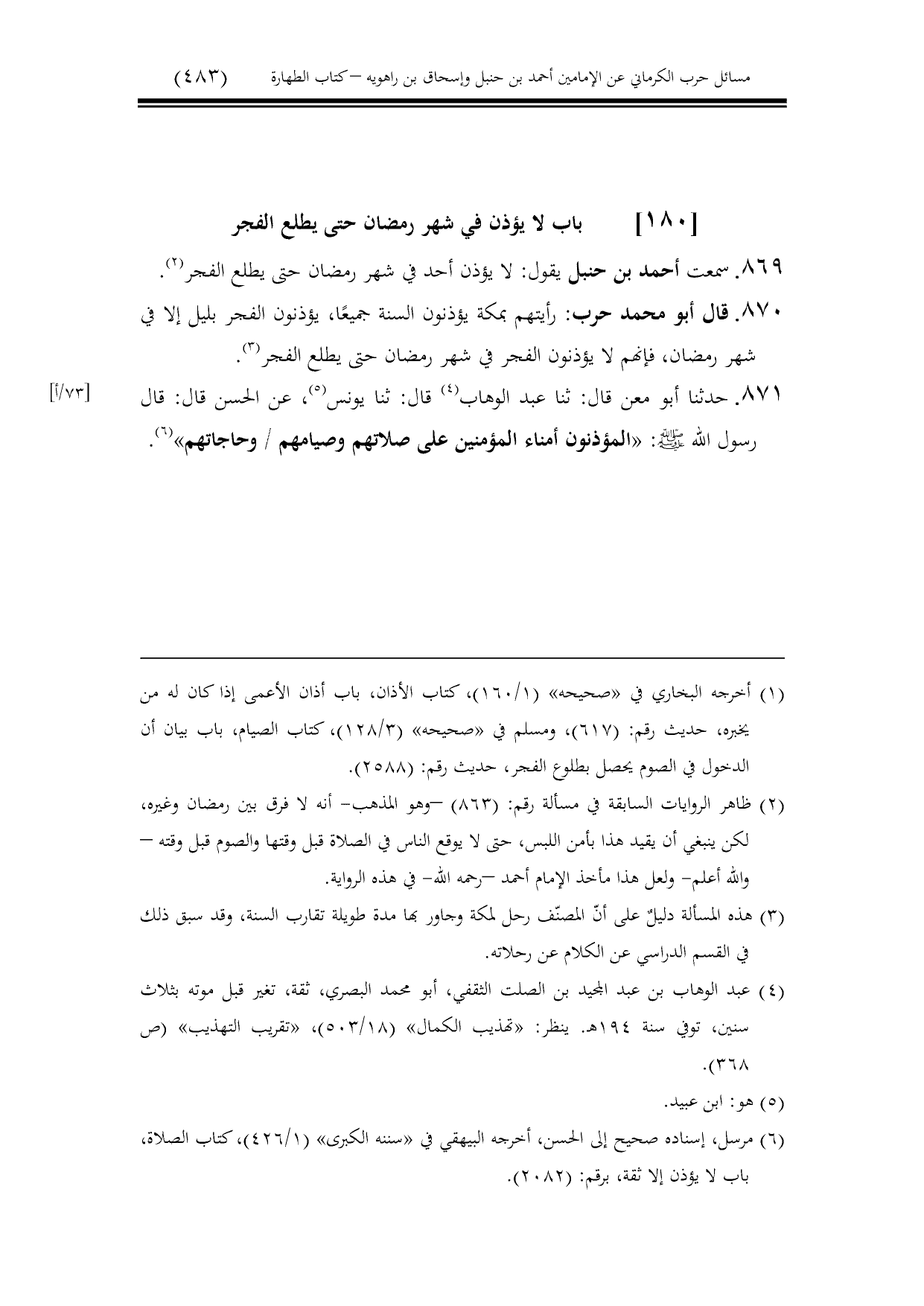 870 - قال أبو محمد حرب: رأيتهم بمكة يؤذنون السنة جميعًا، يؤذنون الفجر بليل إلا في شهر رمضان، فإنهم لا يؤذنون الفجر في شهر رمضان حتى يطلع الفجر.