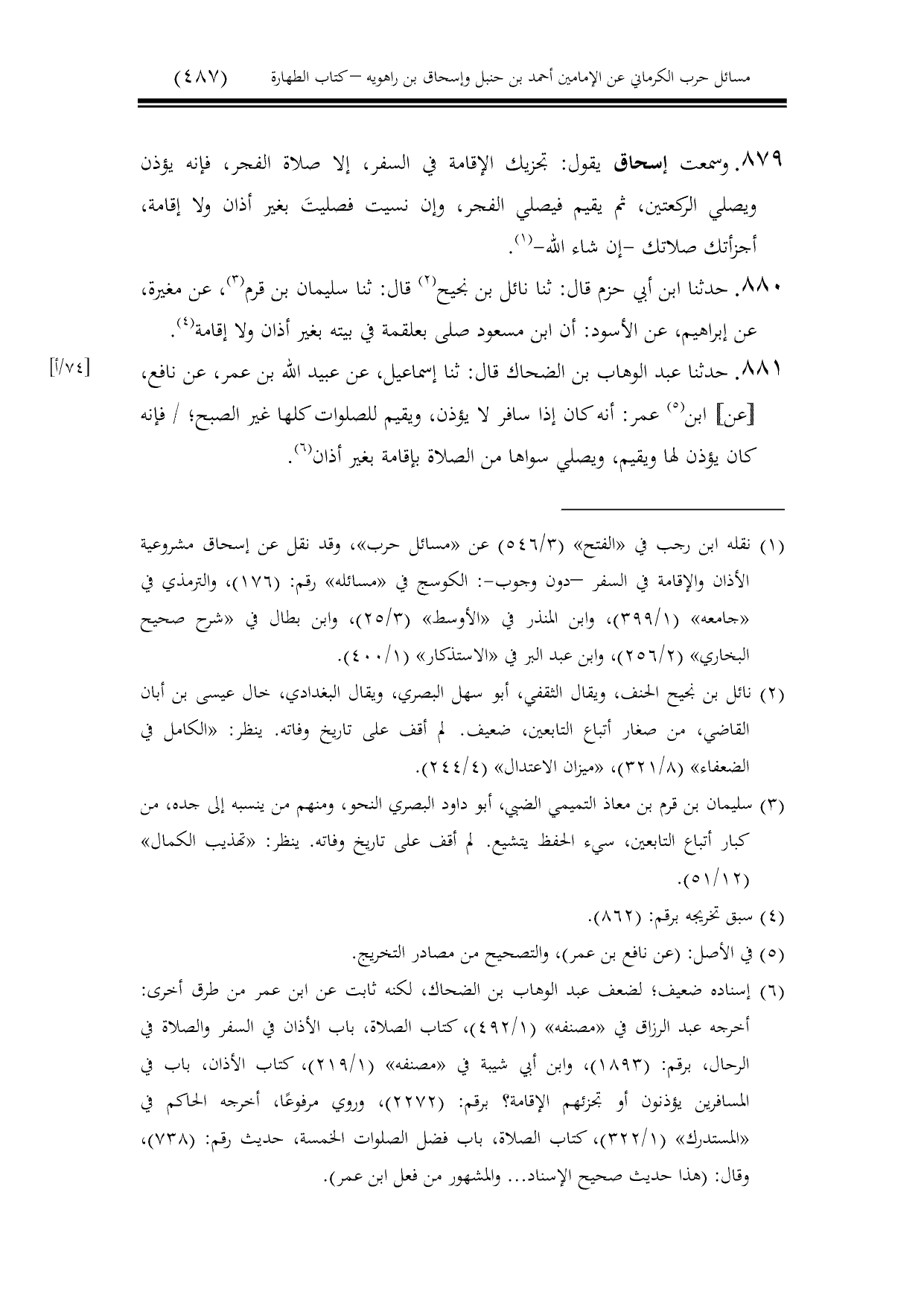 879 - وسمعت إسحاق يقول: تجزيك الإقامة في السفر، إلا صلاة الفجر، فإنه يؤذن ويصلي الركعتين، ثم يقيم فيصلي الفجر، وإن نسيت فصليتَ بغير أذان ولا إقامة، أجزأتك صلاتك -إن شاء الله-.