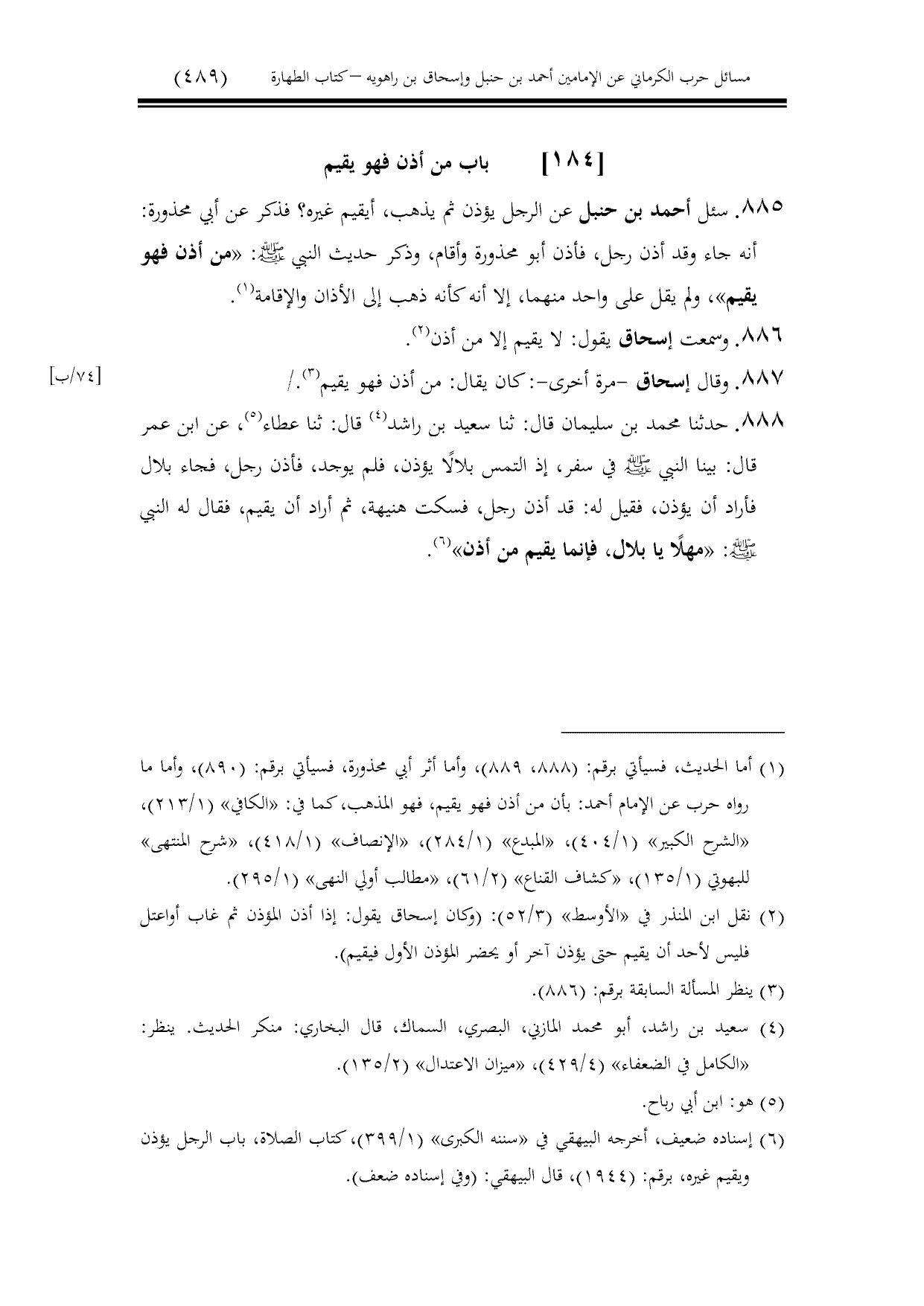 887 - وقال إسحاق -مرة أخرى-: كان يقال: من أذن فهو يقيم./