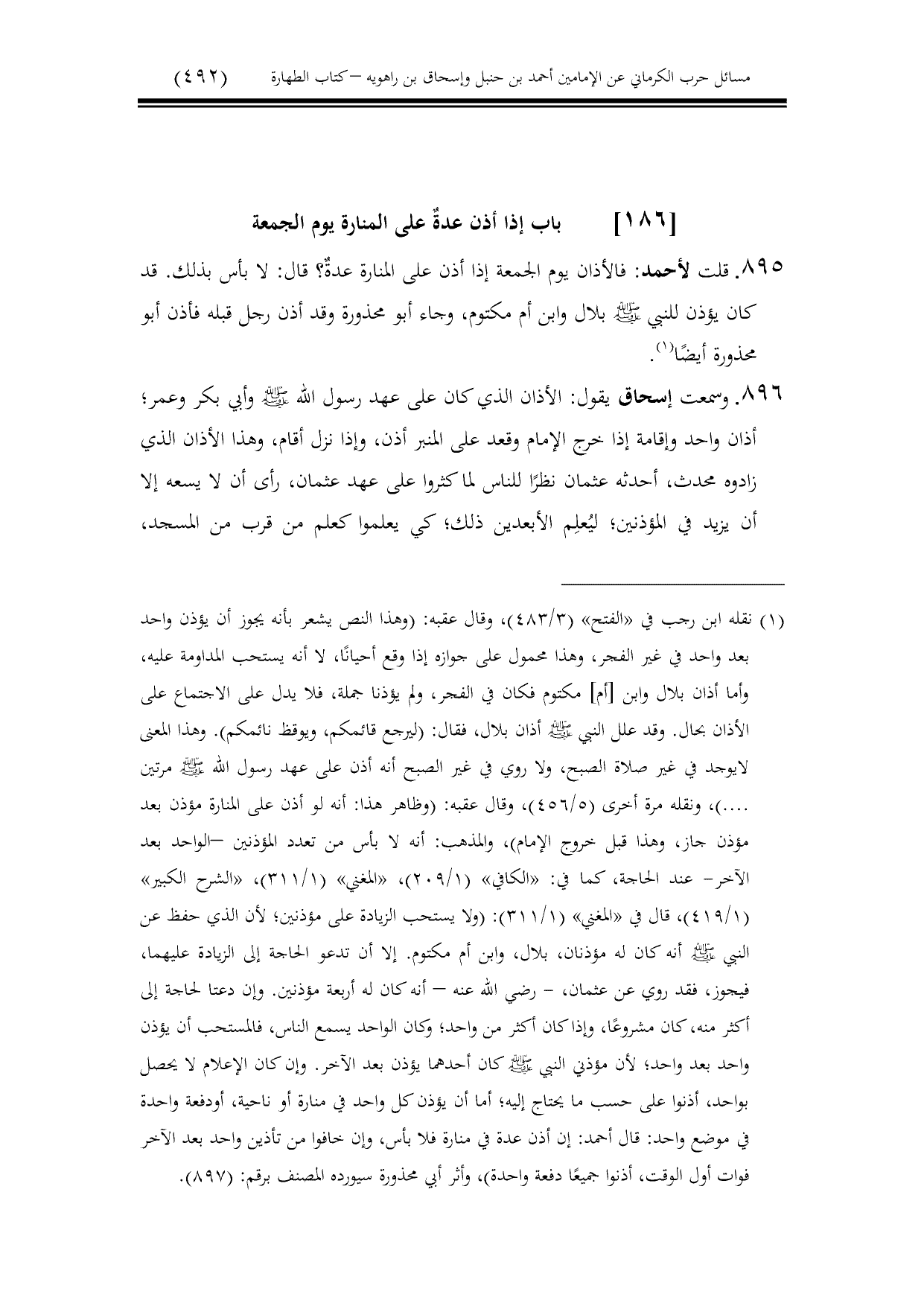 895 - قلت لأحمد: فالأذان يوم الجمعة إذا أذن على المنارة عدةٌ؟ قال: لا بأس بذلك. قد كان يؤذن للنبي - صلى الله عليه وسلم - بلال وابن أم مكتوم، وجاء أبو محذورة وقد أذن رجل قبله فأذن أبو محذورة أيضًا.