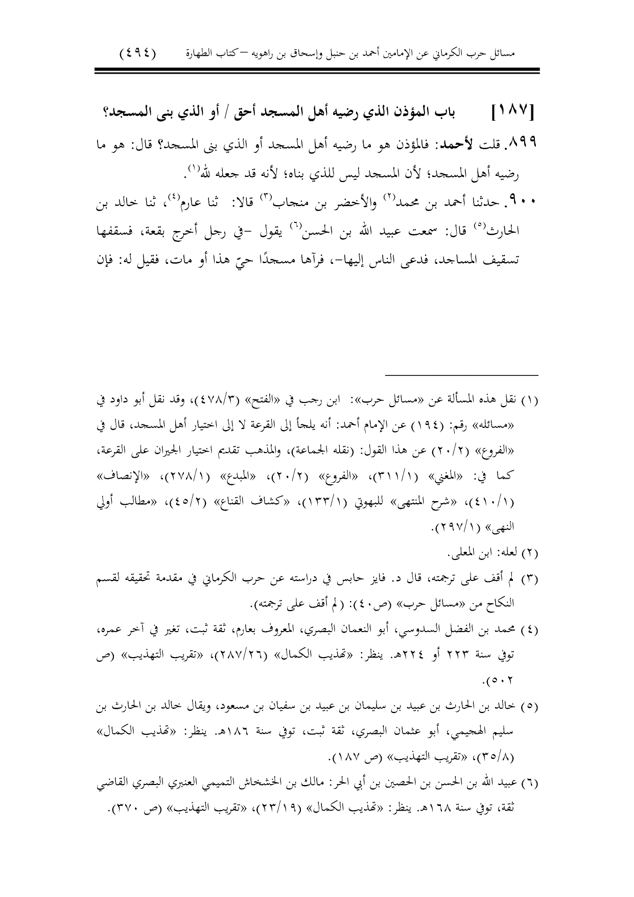 900 - حدثنا أحمد بن محمد والأخضر بن منجاب قالا: ثنا عارم، ثنا خالد بن الحارث قال: سمعت عبيد الله بن الحسن يقول -في رجل أخرج بقعة، فسقفها تسقيف المساجد، فدعى الناس إليها-، فرآها مسجدًا حيّ هذا أو مات، فقيل له: فإن