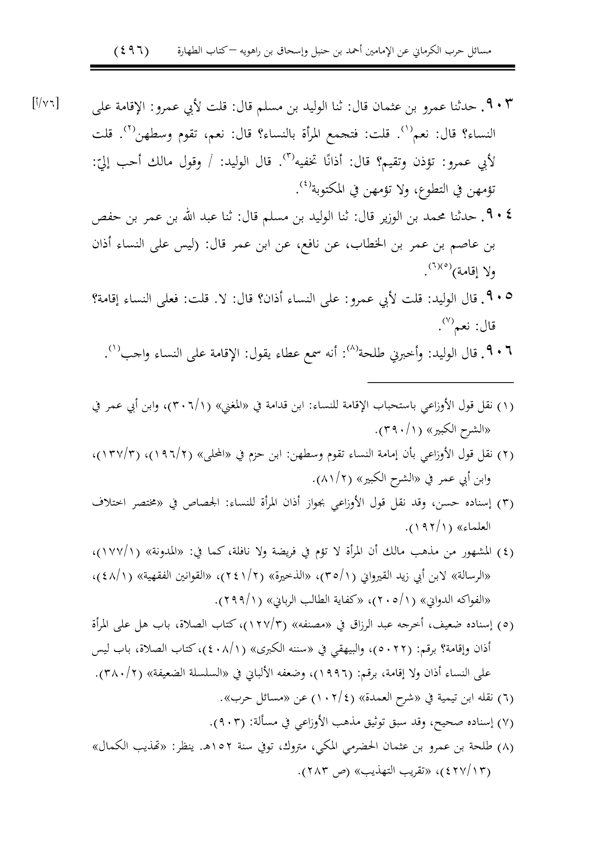 905 - قال الوليد: قلت لأبي عمرو: على النساء أذان؟ قال: لا. قلت: فعلى النساء إقامة؟ قال: نعم.
