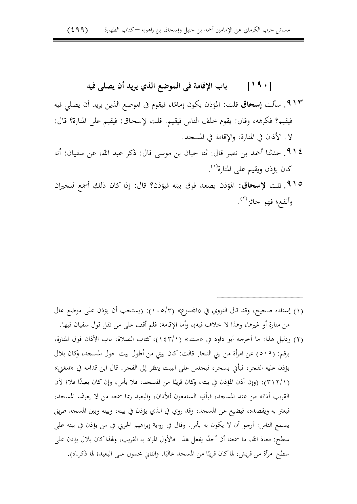913 - سألت إسحاق قلت: المؤذن يكون إمامًا، فيقوم في الموضع الذين يريد أن يصلي فيه فيقيم؟ فكرهه، وقال: يقوم خلف الناس فيقيم. قلت لإسحاق: فيقيم على المنارة؟ قال: لا. الأذان في المنارة، والإقامة في المسجد.